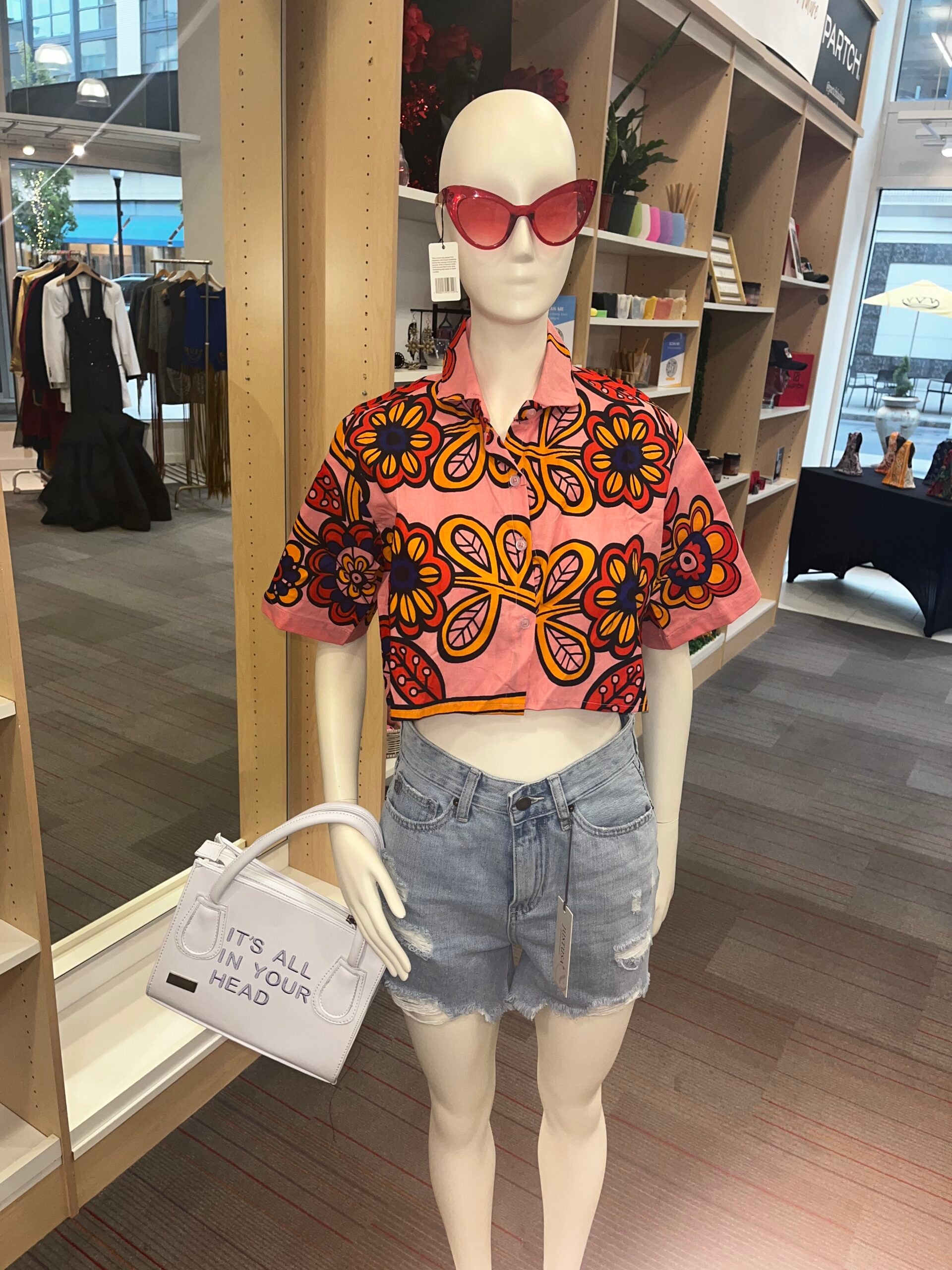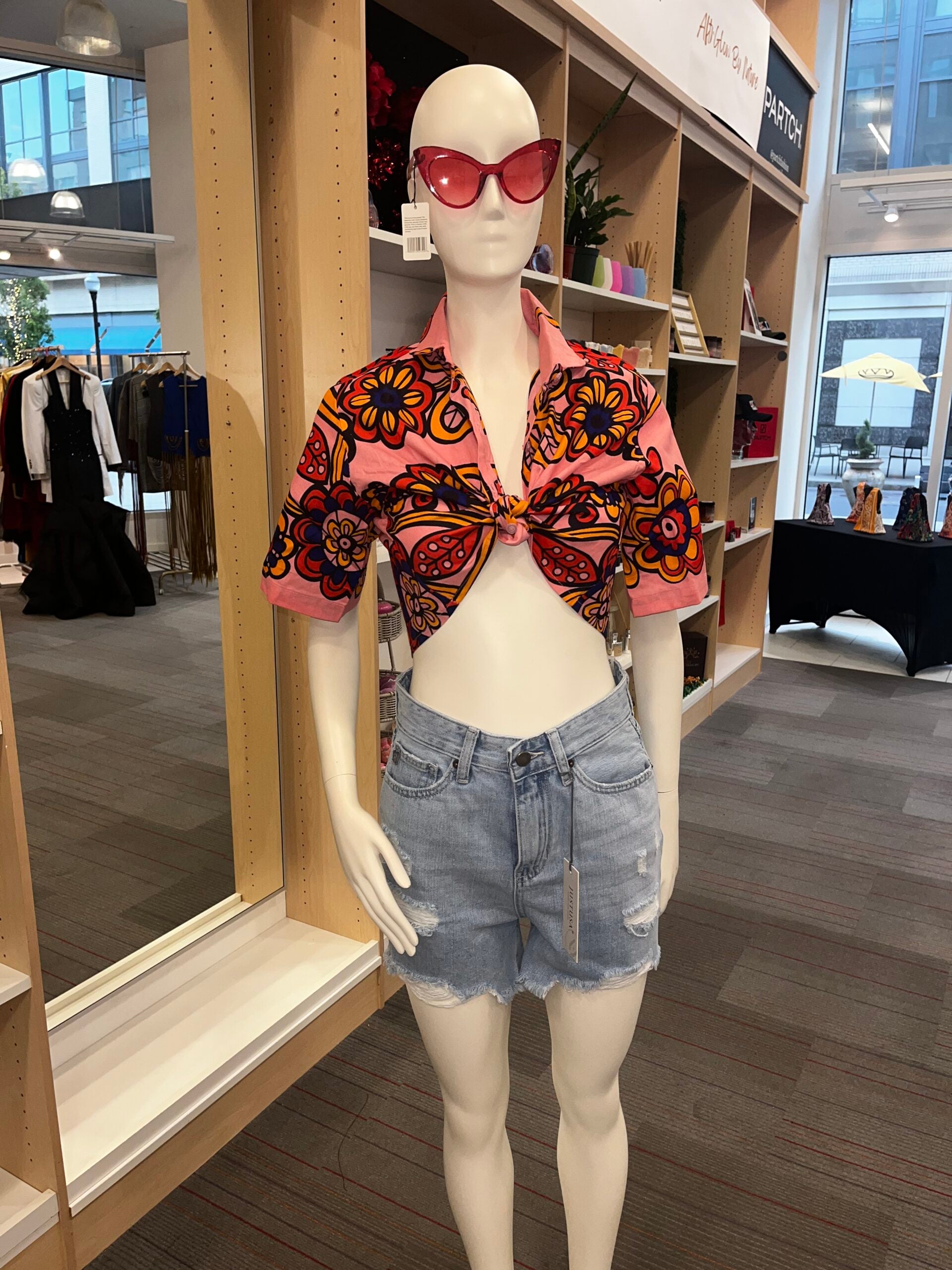 This cropped Button up is a perfect summer essential! Wear it as a nice loose top or tie it up for versatility. This print pairs effortlessly with your favorite summer bottoms.