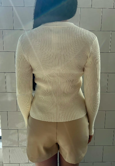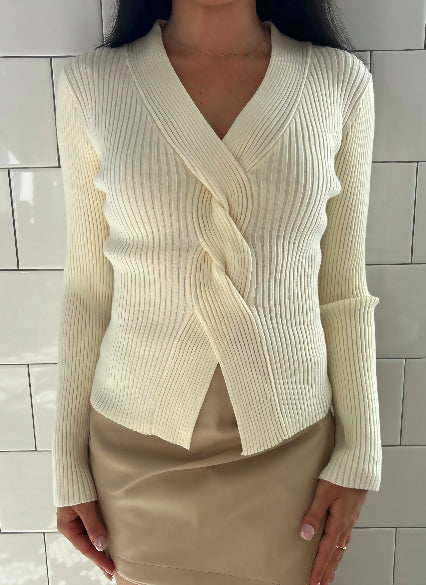 Your classic ribbed knit sweater with a twist. This beautiful off-white garment is cozy and stylish. The unique twist front detail adds a fashionable element to a timeless sweater, making it trendy and comfortable. It is a versatile choice for various occasions, from casual outings to more dressy events.