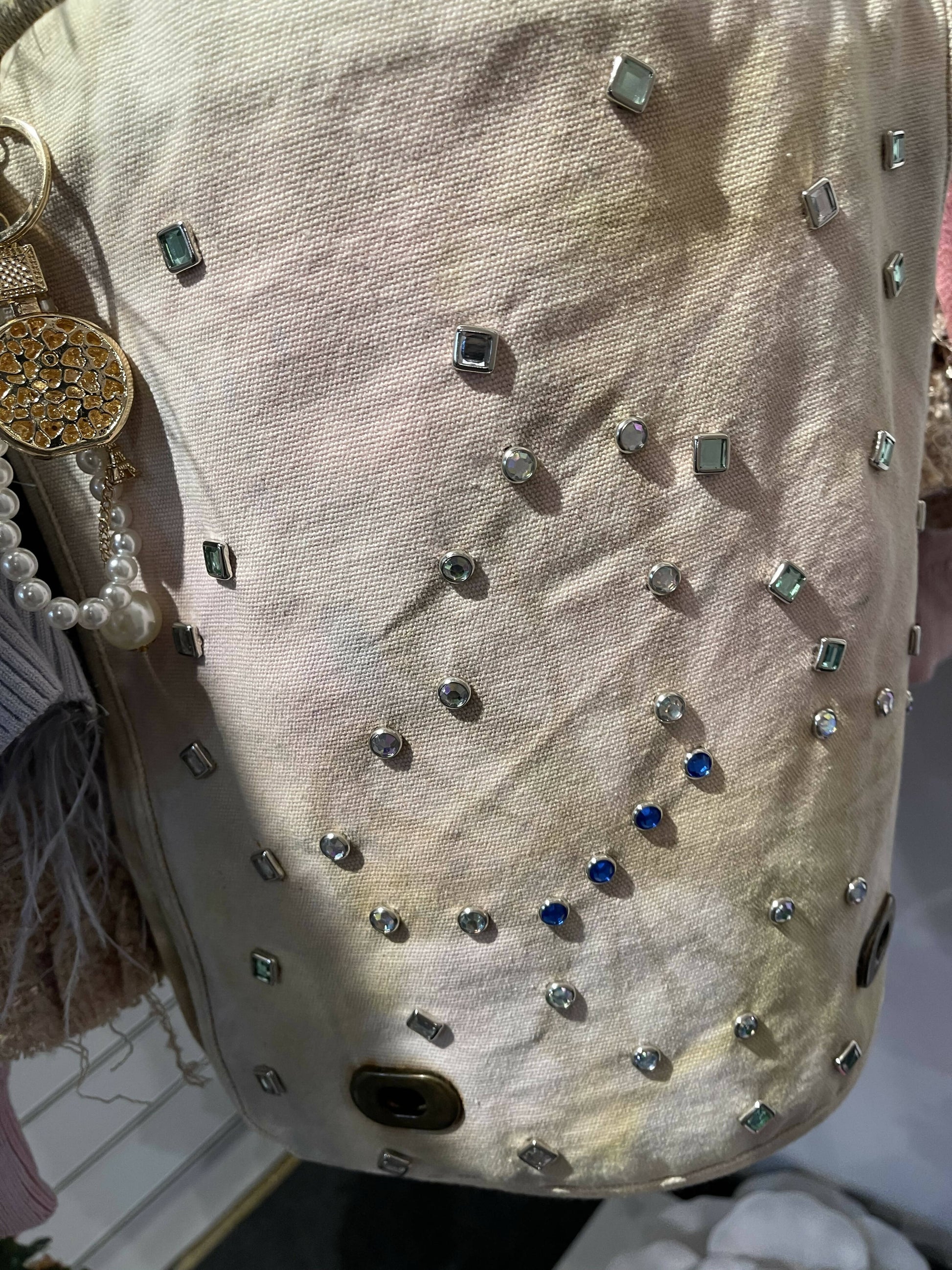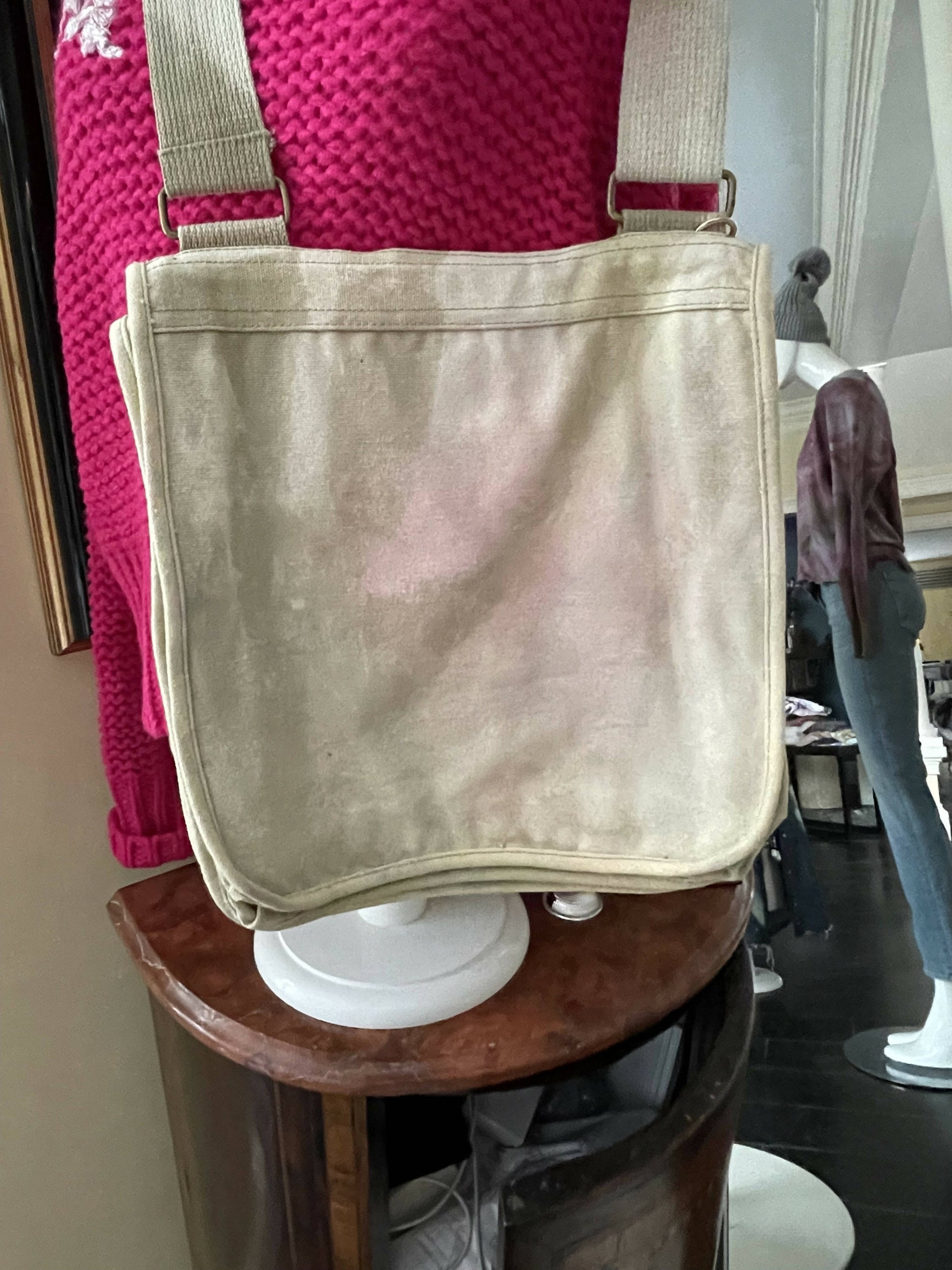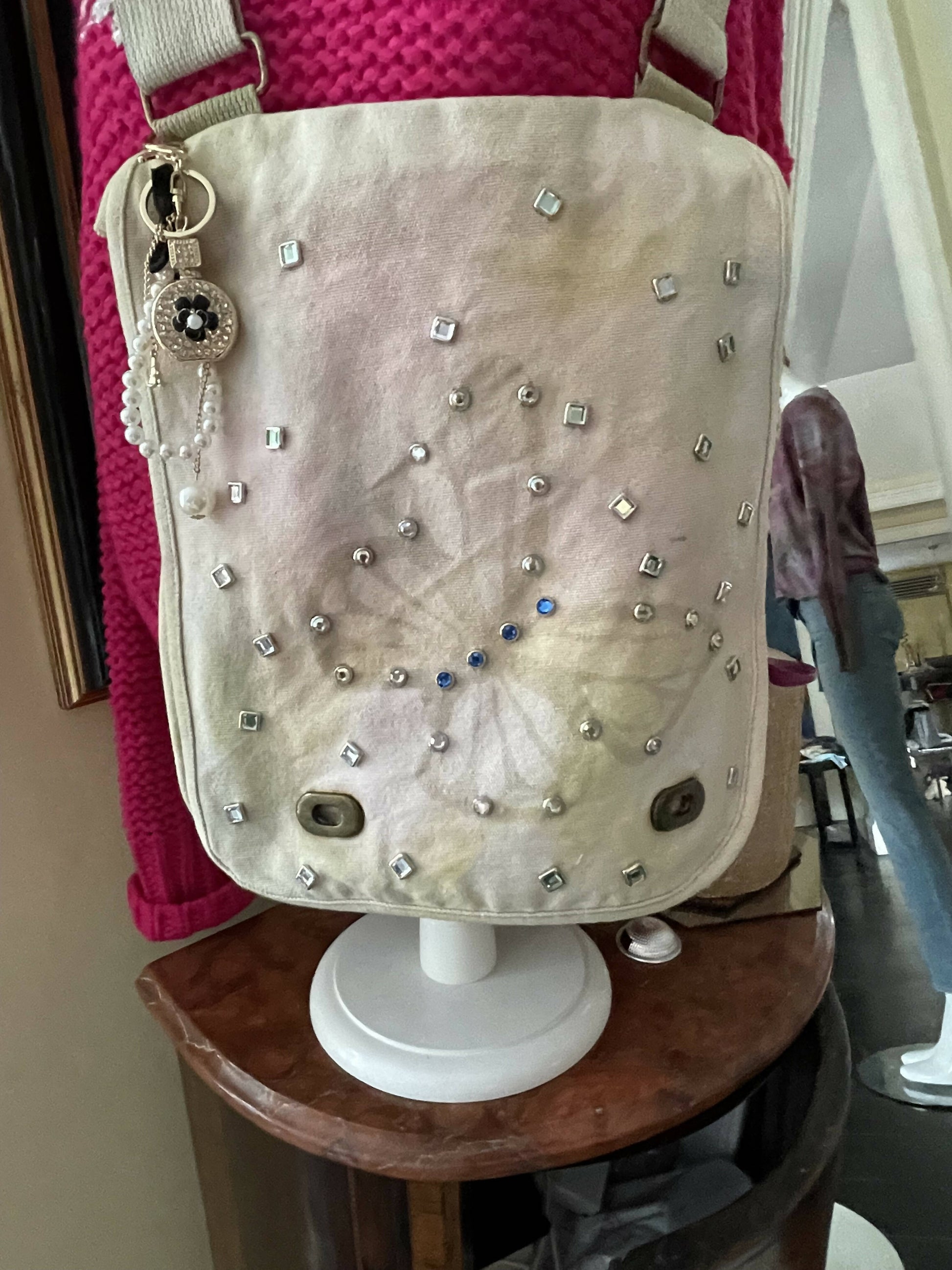 Color treated army bag (messenger) can be worn long or short (adjustable). Embellished with studs to create butterfly . All handcrafted.