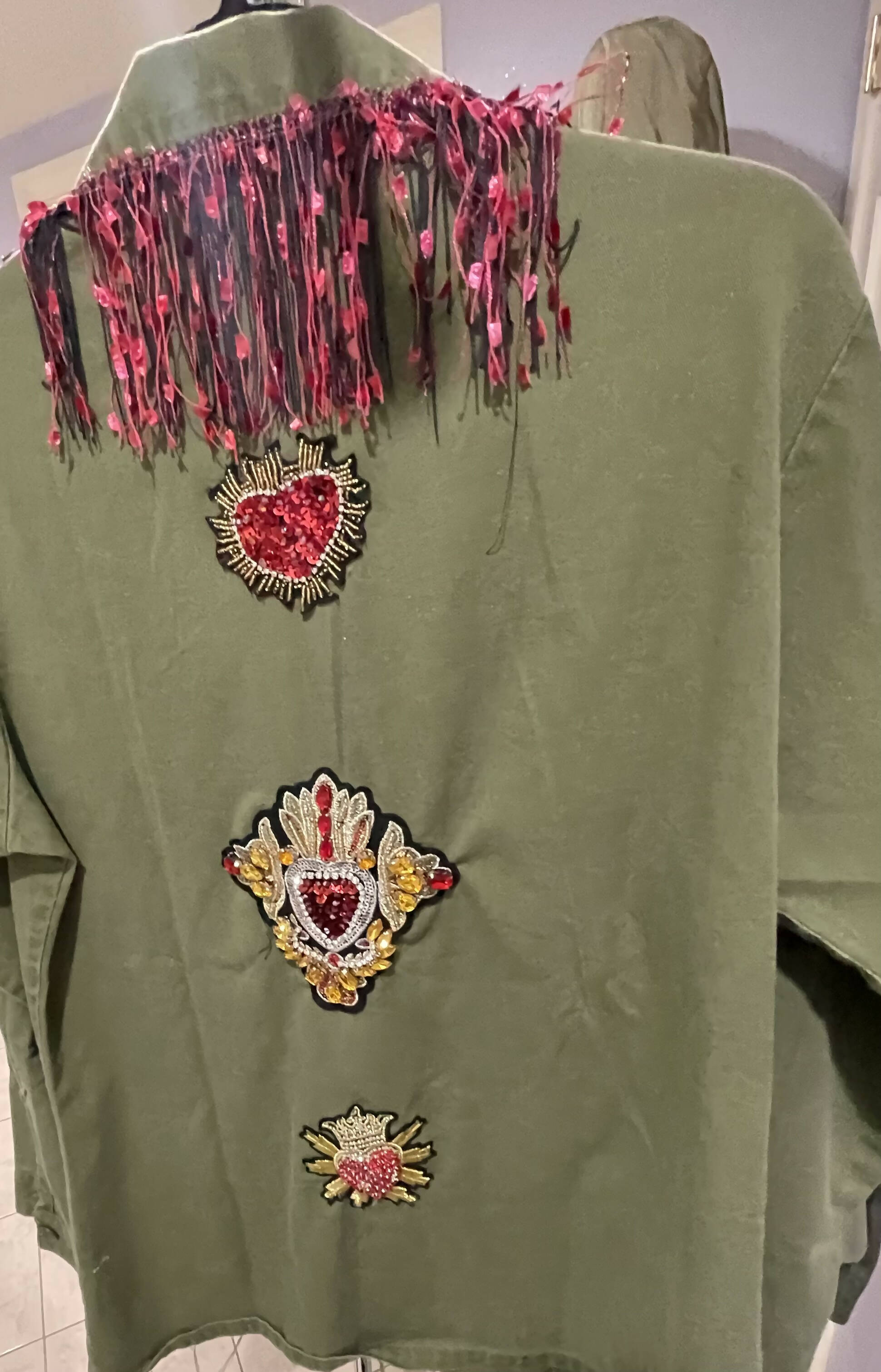 Authentic Military Jacket Embellished w sequined hearts & crown on front w fringe collar - 3 hearts on back