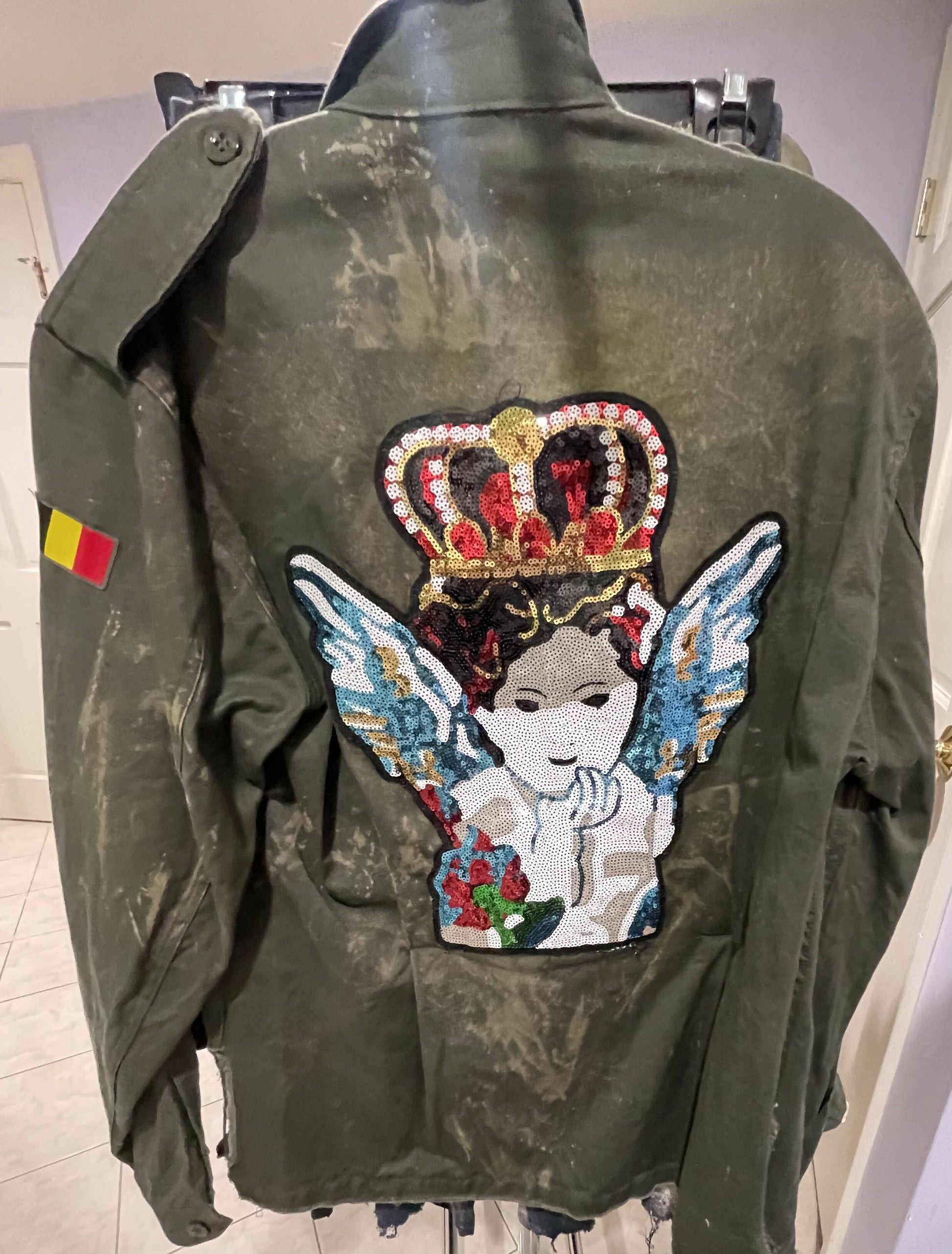Authentic Military Jacket Embellished - Gold Paisley on front & Sequined Angel w crown on back
