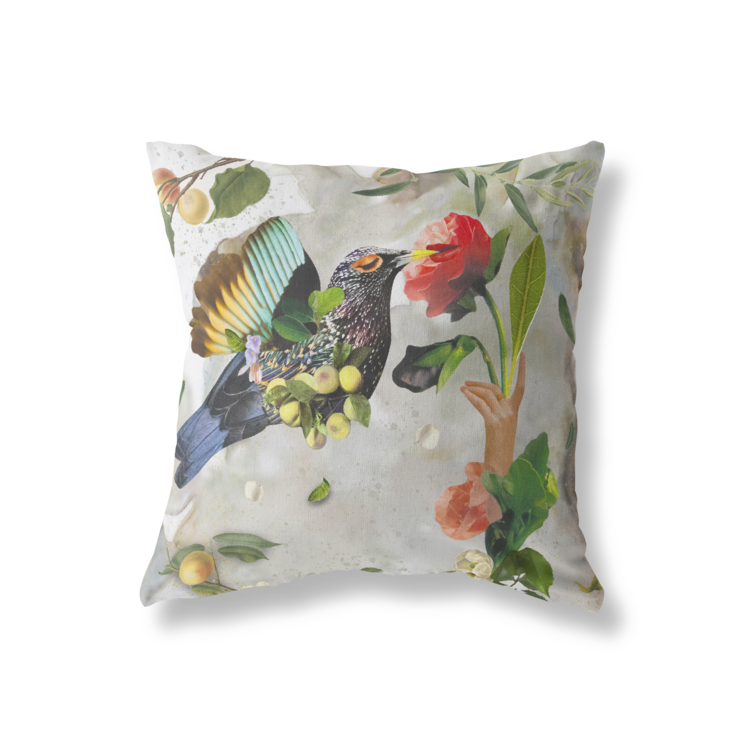 Bold in color and style this pillow cover depicts the mystery of a bird hovering over a flower collage. The design is digitally printed on soft yet durable satin using eco-safe sublimation inks with a silver-gray velvet reverse.