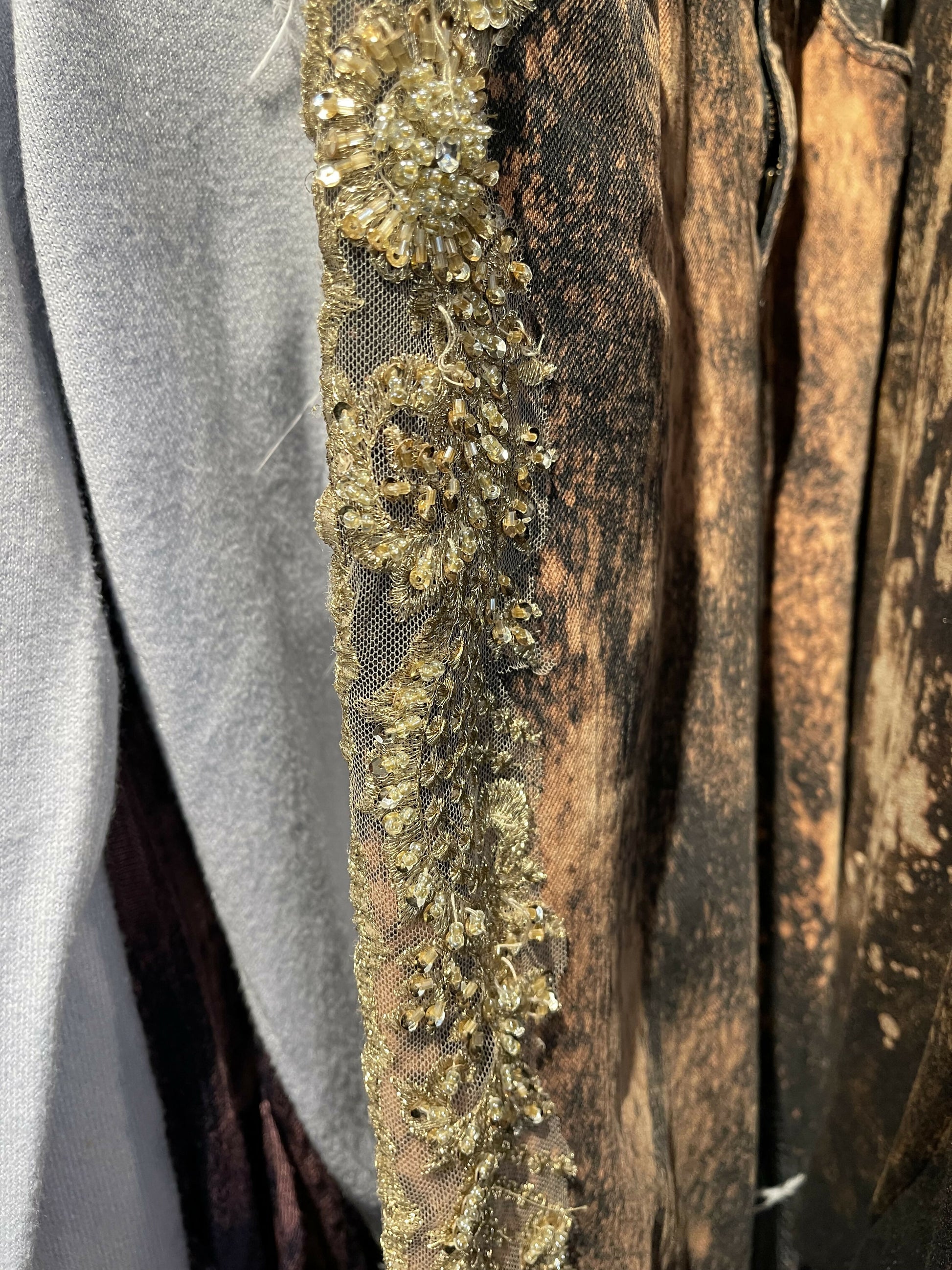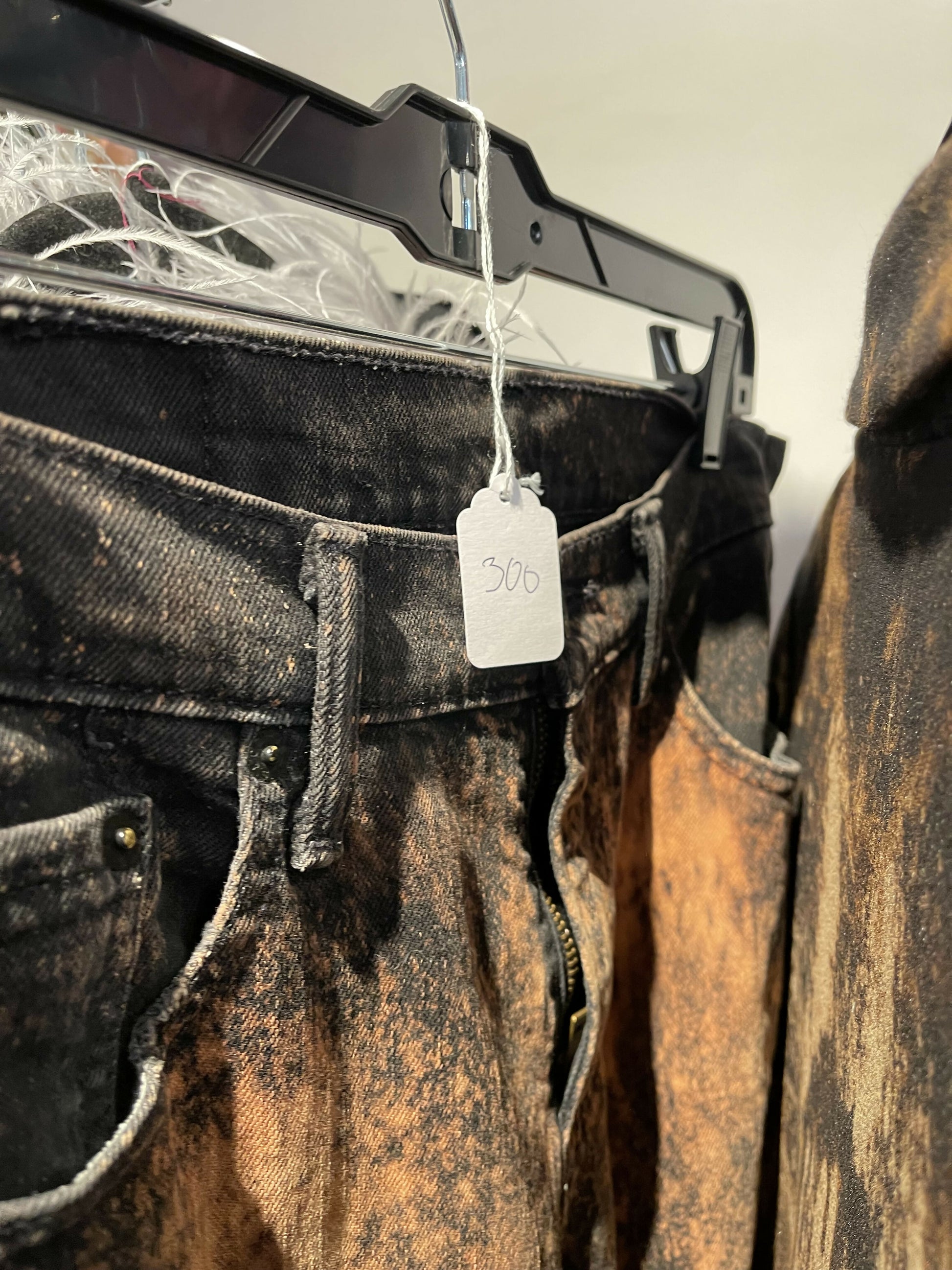 Size 32 black denim color removal with 3d gold flower applique on one side of leg.