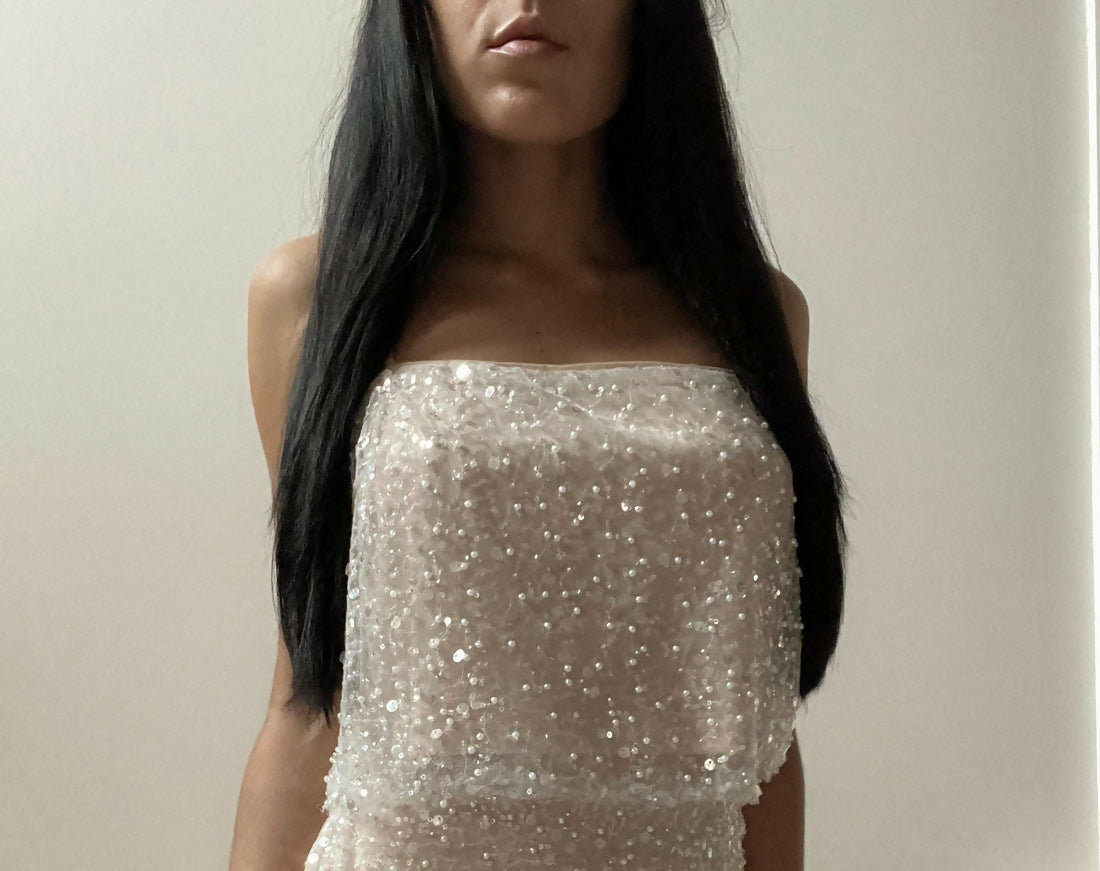 Create the perfect night-out outfit by starting with our Bria Pearl Tank. Designed in luxe, double-layered mesh fabric with all-over pearl and sequin embellishment, this crop top works to show off your figure and make you shimmer all night long. Pair with our matching mini skirt to elevate this style to couture levels.