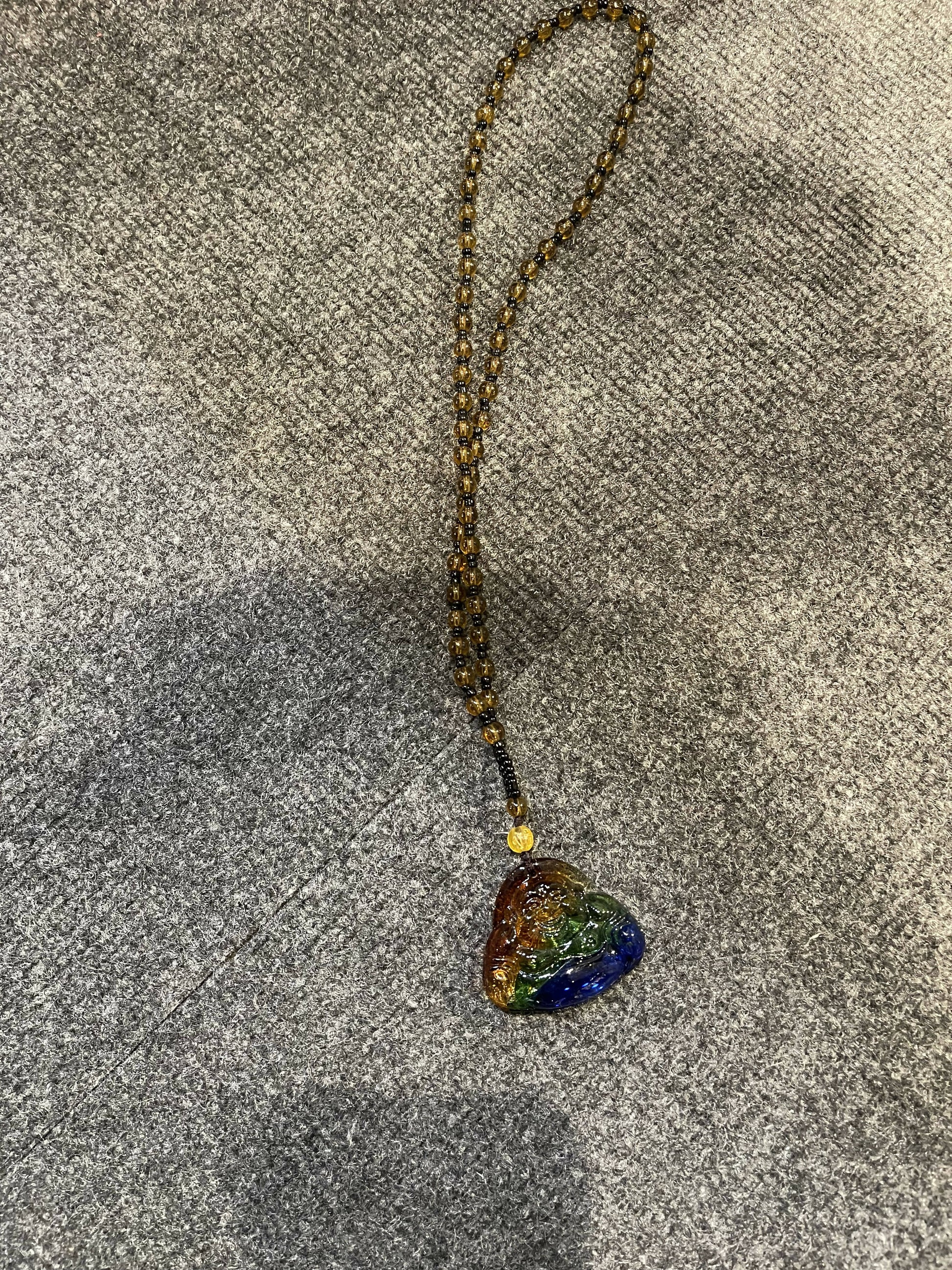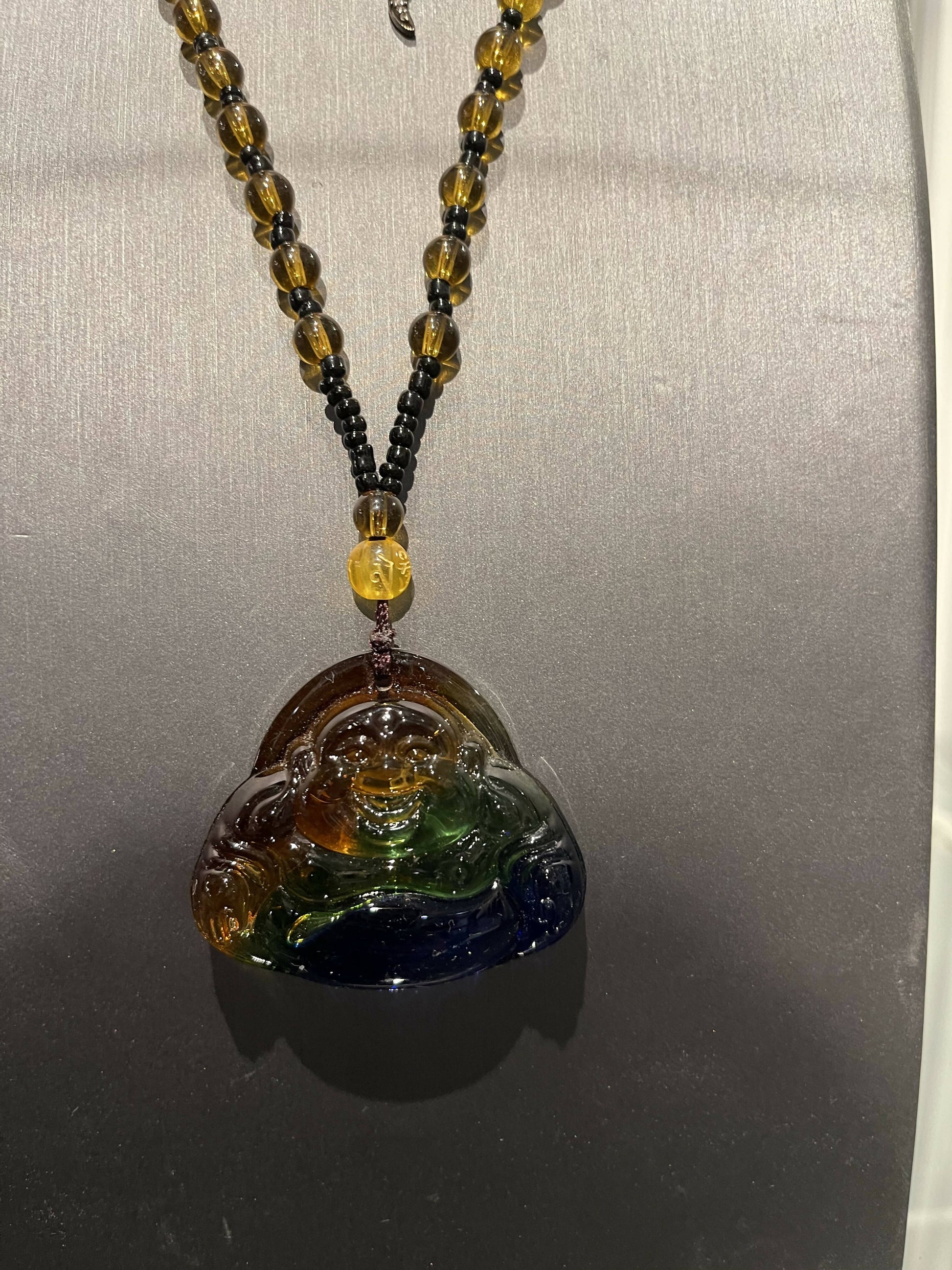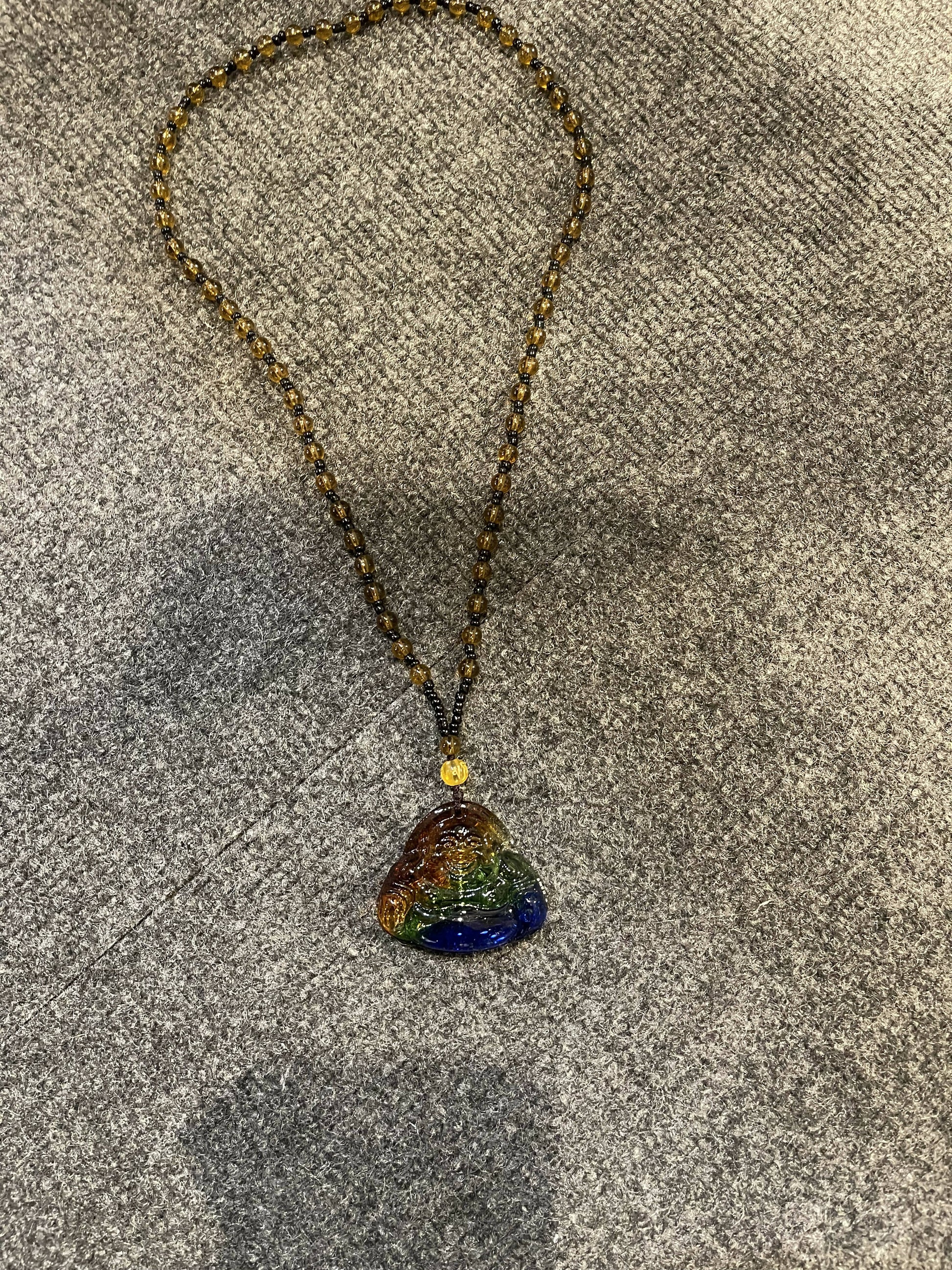 16 inch multicolor necklace on leather. Enhanced with a glass multi color buddha
