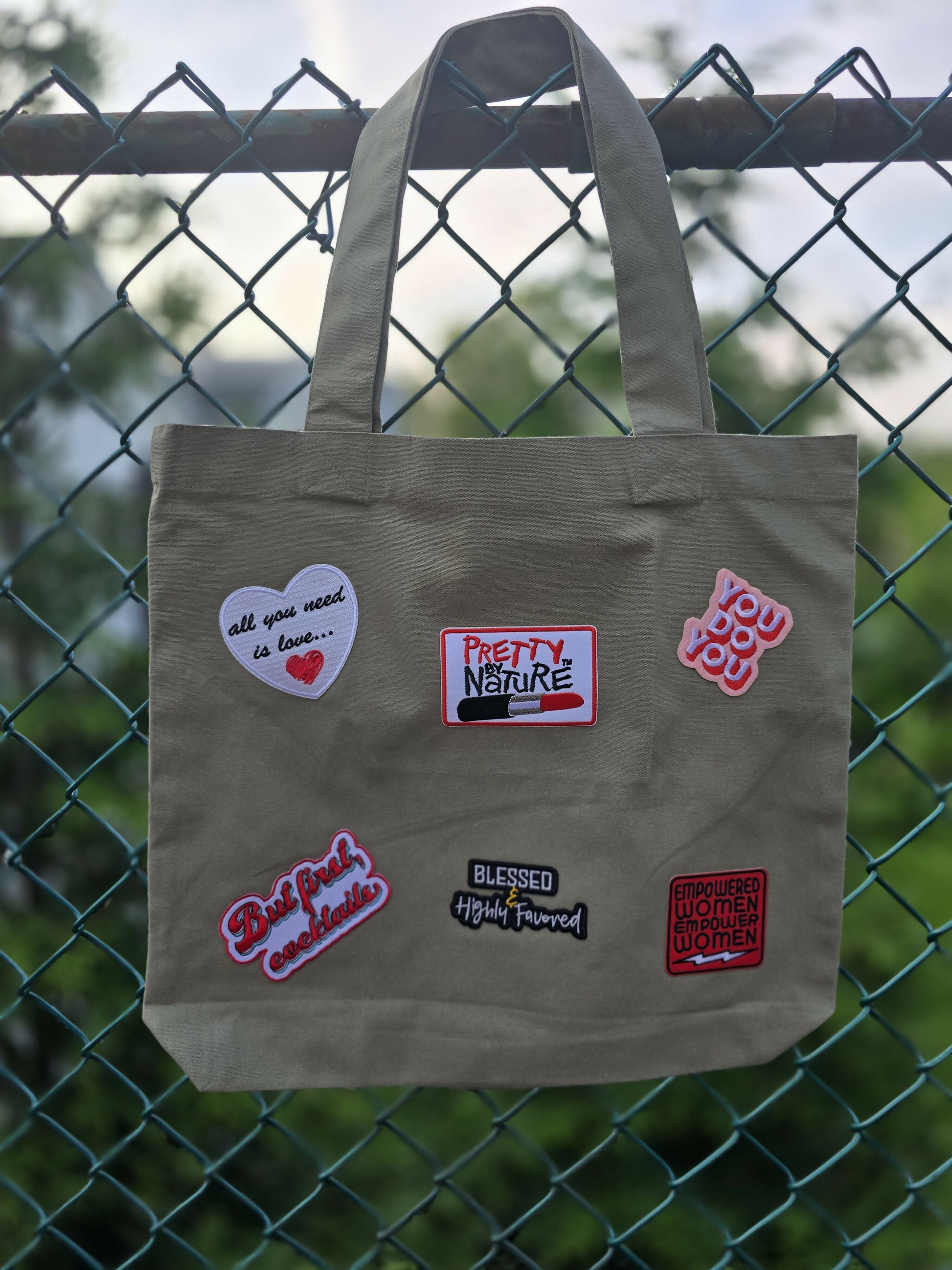 Add some playful charm to your daily essentials with this stylish tote bag, decorated with bold embroidered patches that speak to your fun-loving personality. From the cheeky “But First, Cocktails” to empowering slogans like "Blessed & Highly Favored," this tote is a perfect blend of humor and confidence. The soft, olive green canvas provides a versatile base that pairs well with any outfit, while the vibrant patchwork design adds a pop of personality.