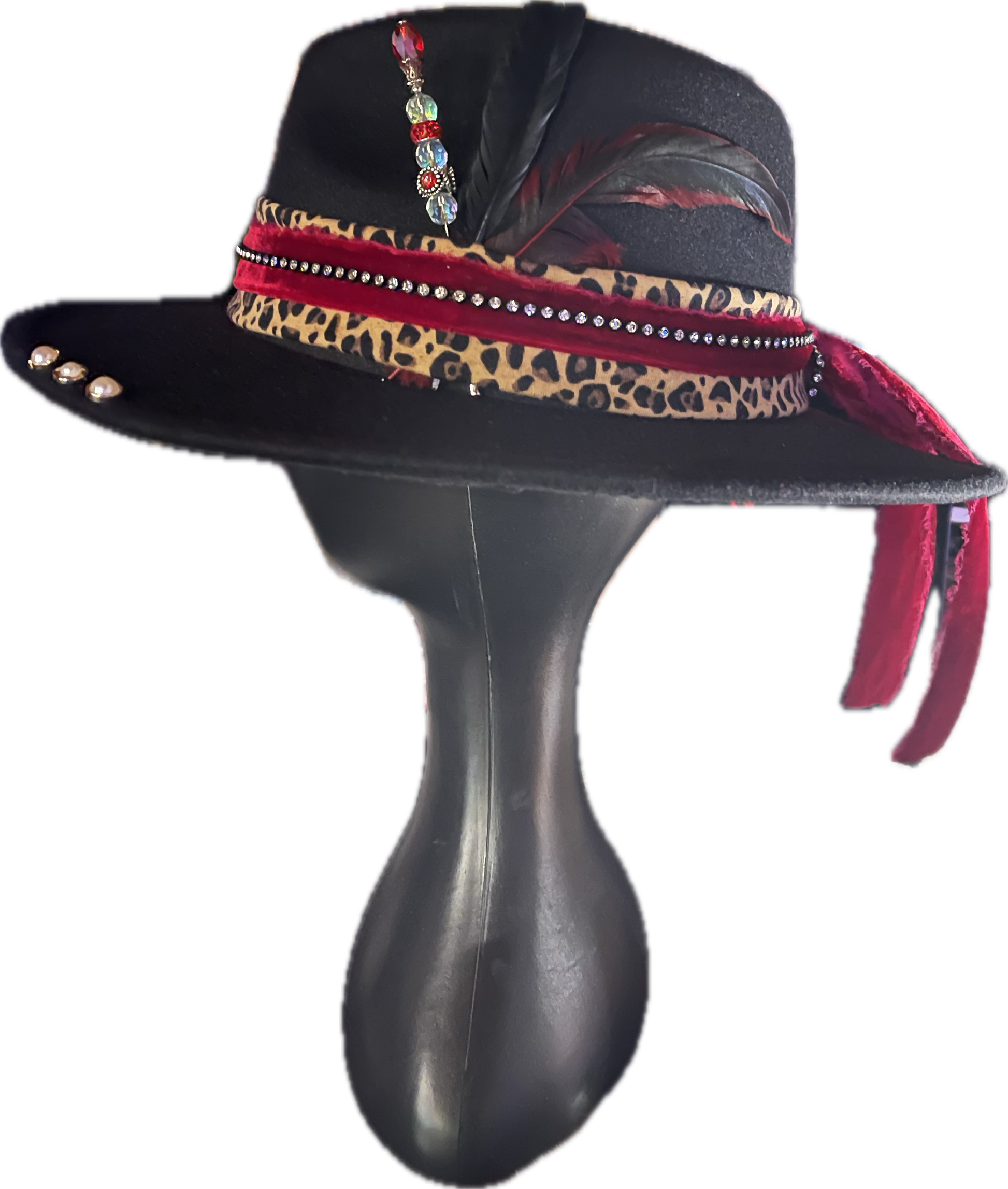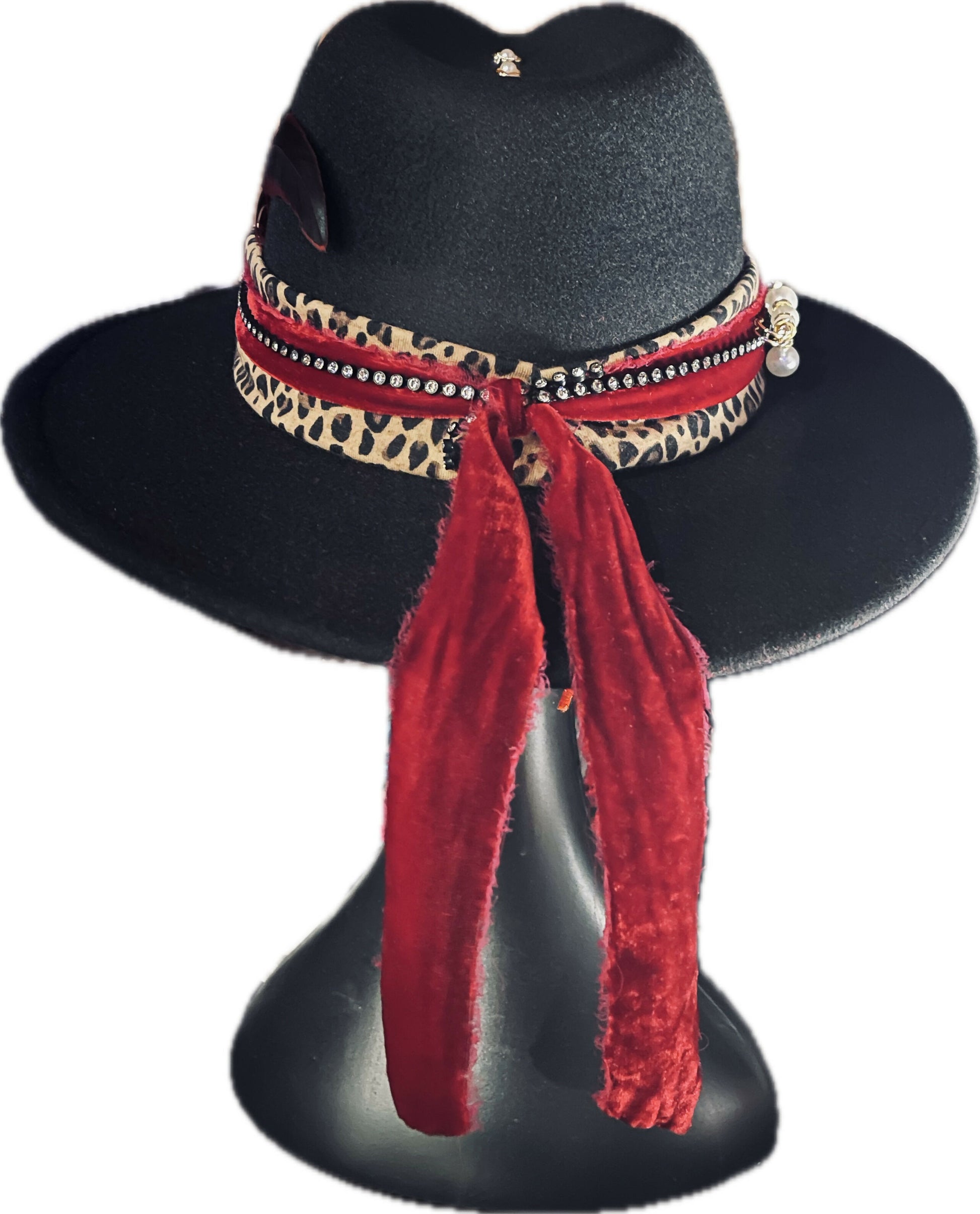 Custom Handmade Wide Brim Fedora Hat. Leopard with Red Velvet Trim and black crystal trim. Designed with feathers, hat pin with jeweled beads and pearl pin accessories. This is a beautiful hat to wear all year!