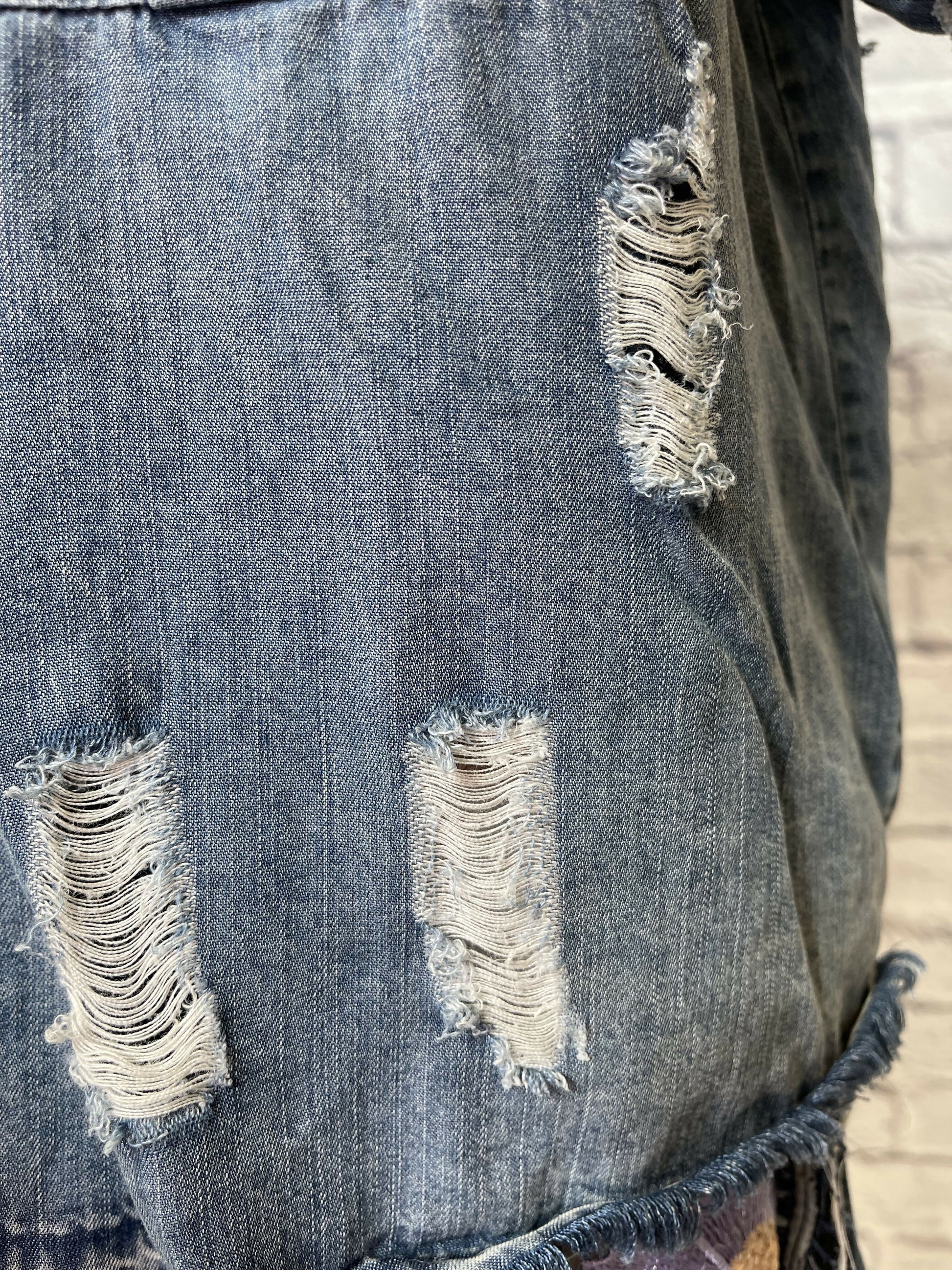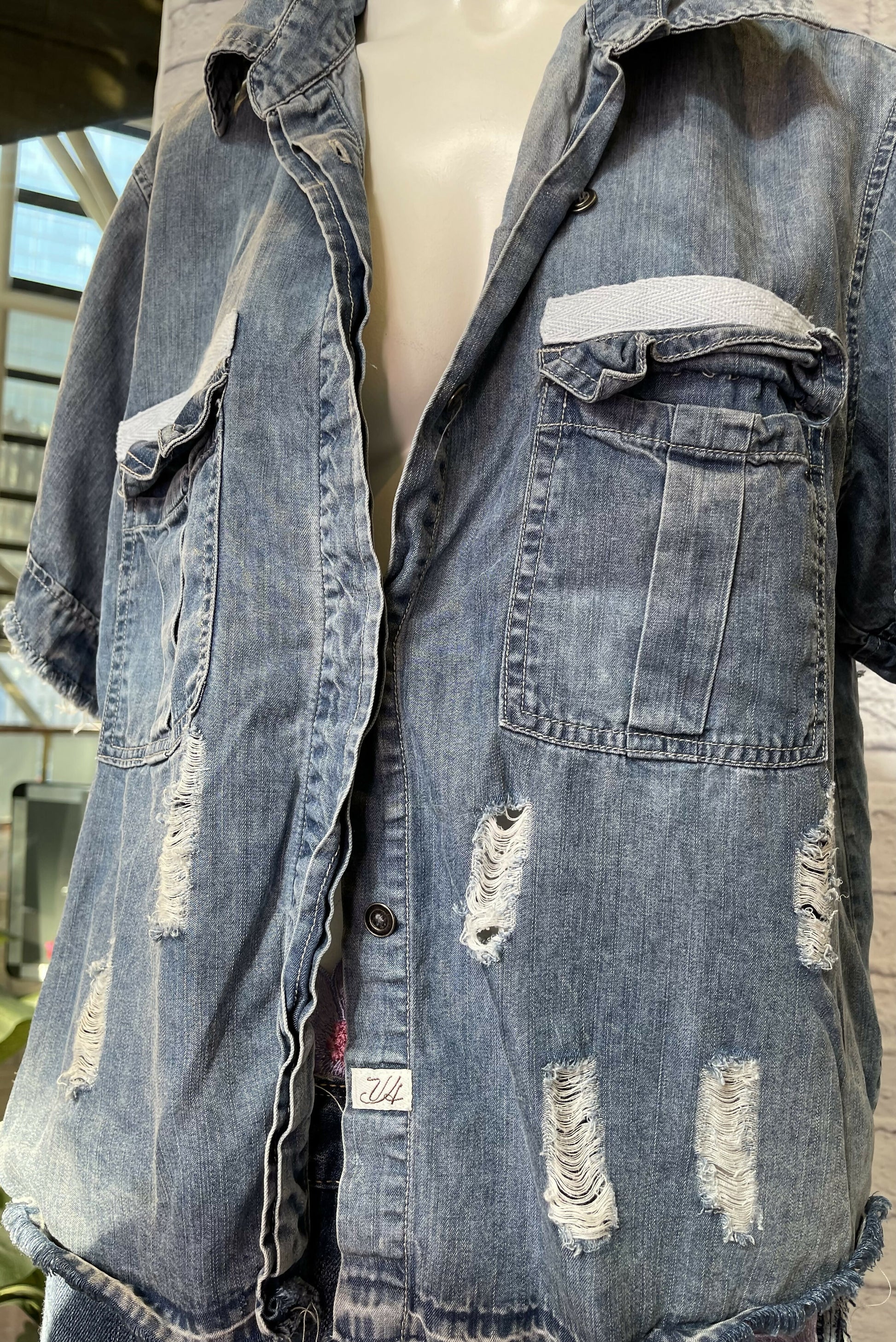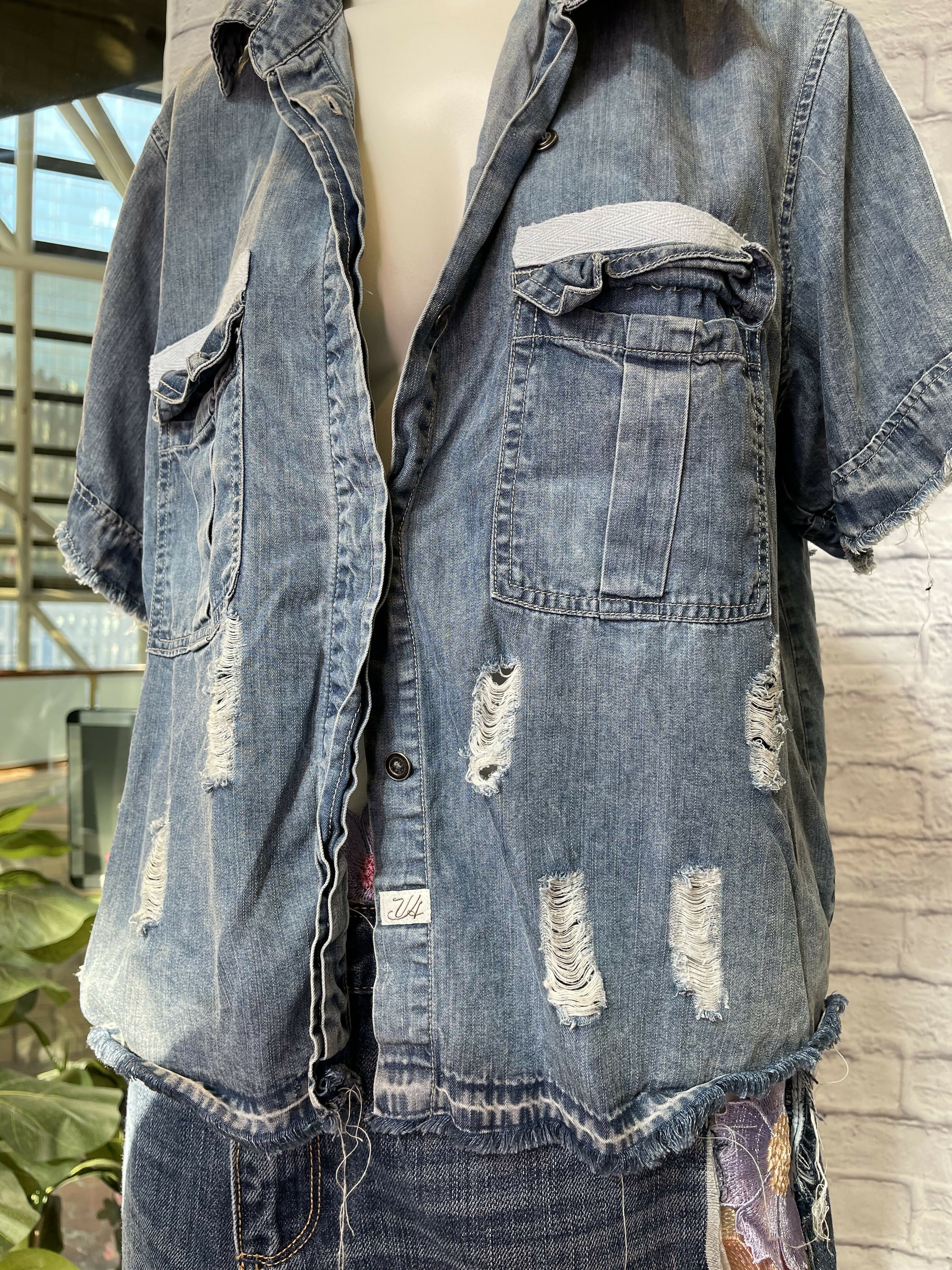 M/l denim shirt with handcraft rips with braided back trim. Machine wash and dry.
