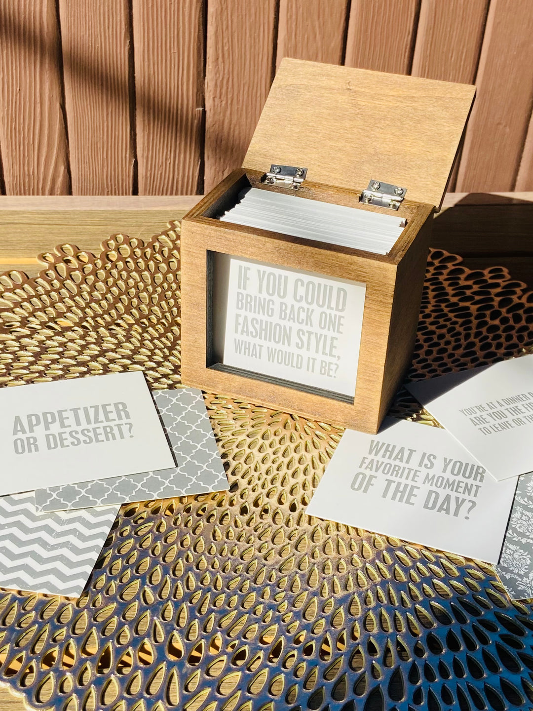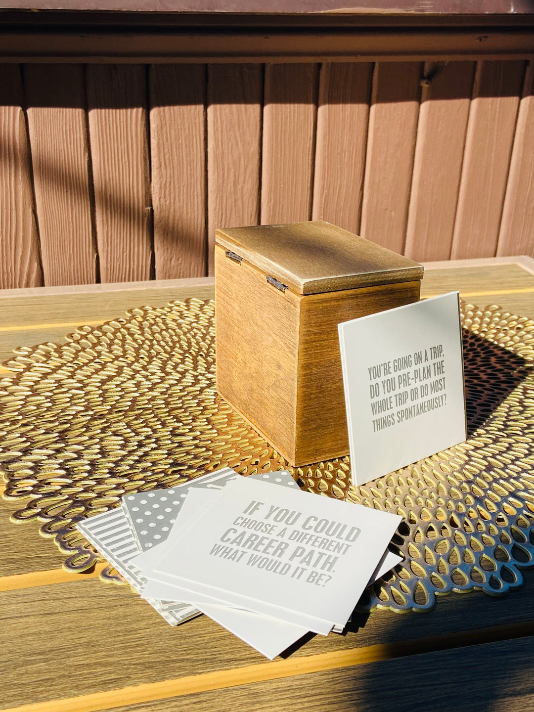 Paper cards, wooden keepsake box, and metal hinges.