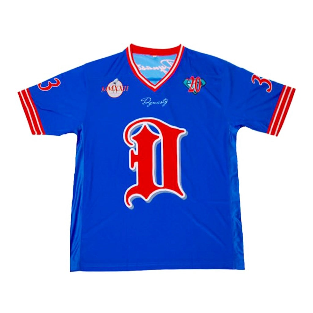 DYNASTY Blue Football Jersey with Red Logo & Anniversary patch. Also DYNASTYBowl patch .