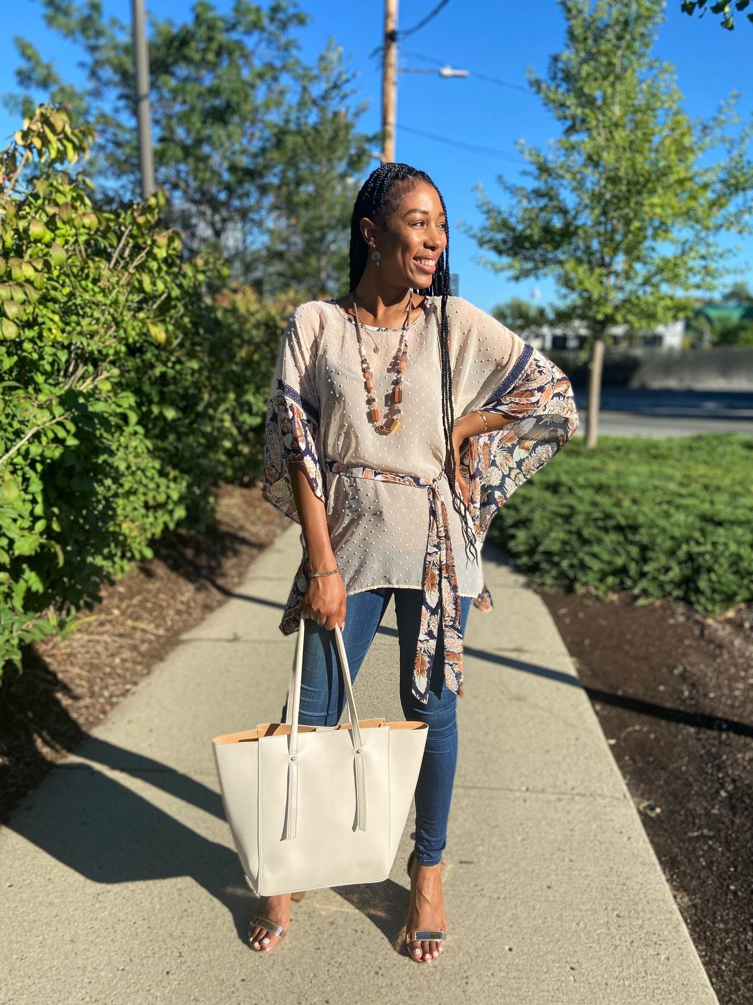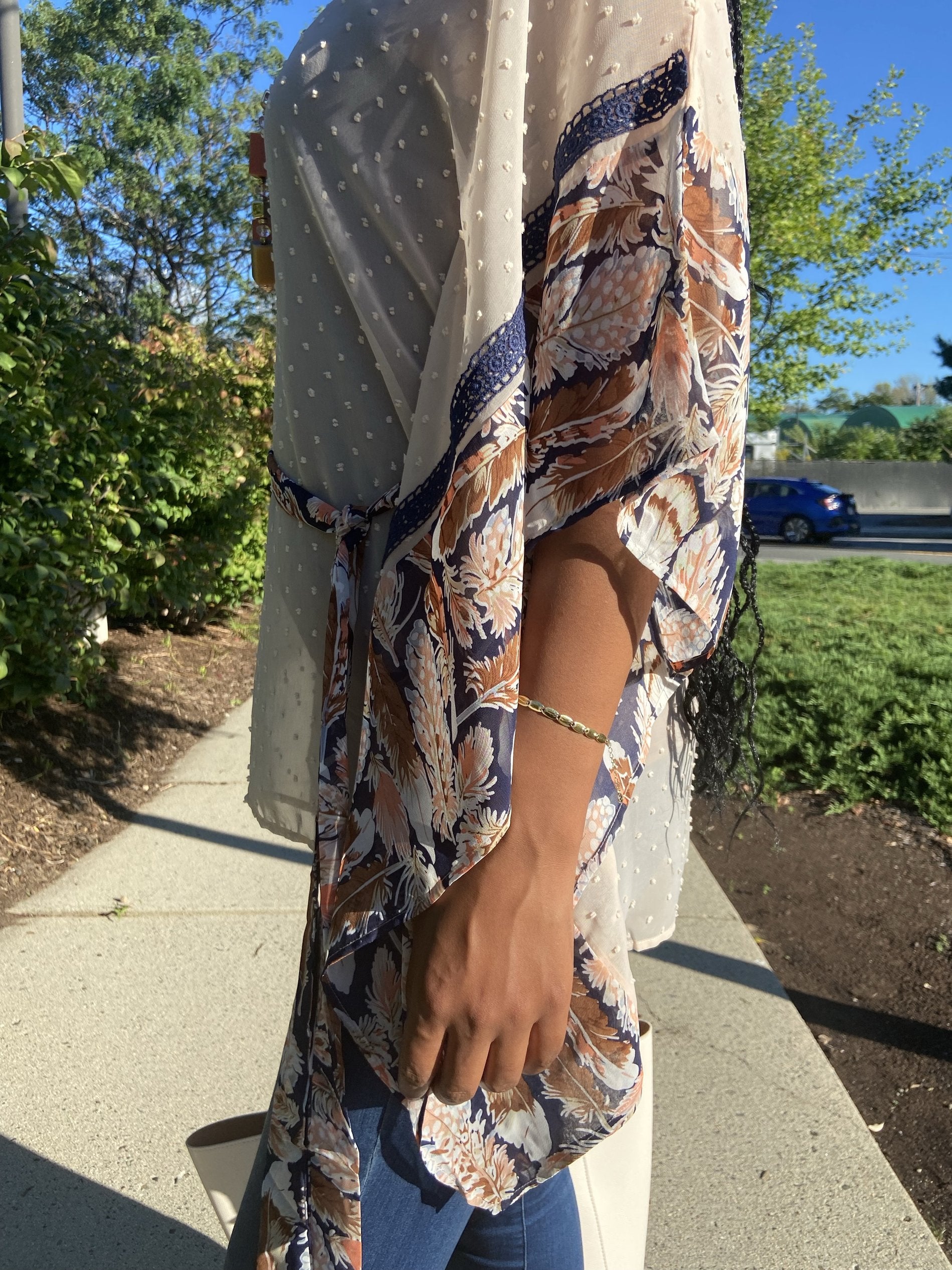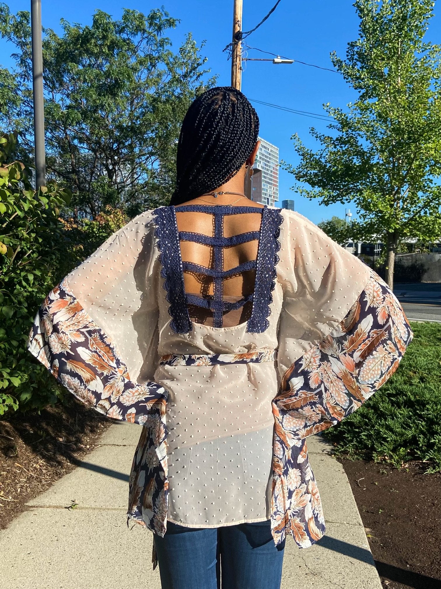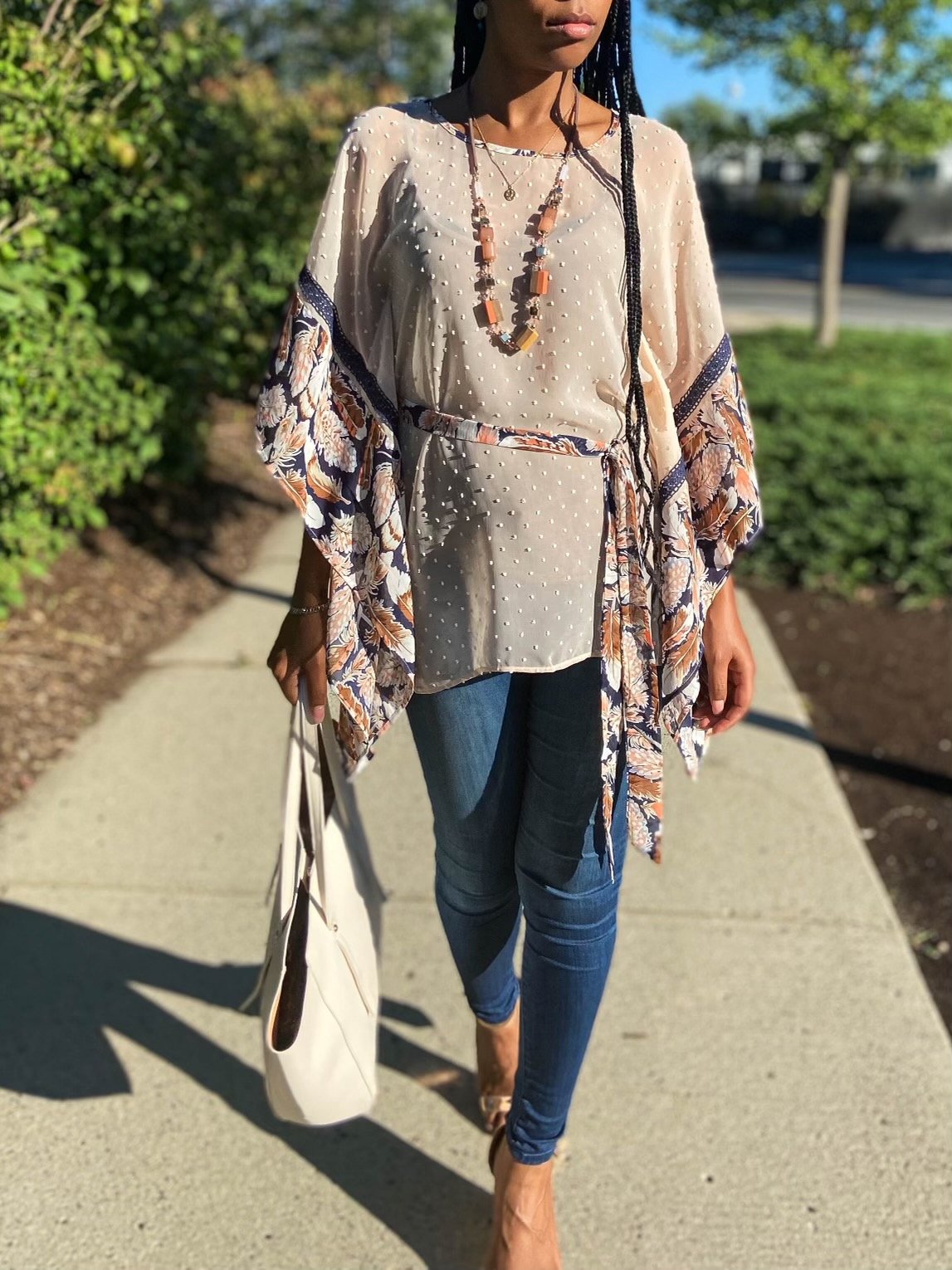 FEATHER PRINT TRIM PONCHOLIKE BLOUSE