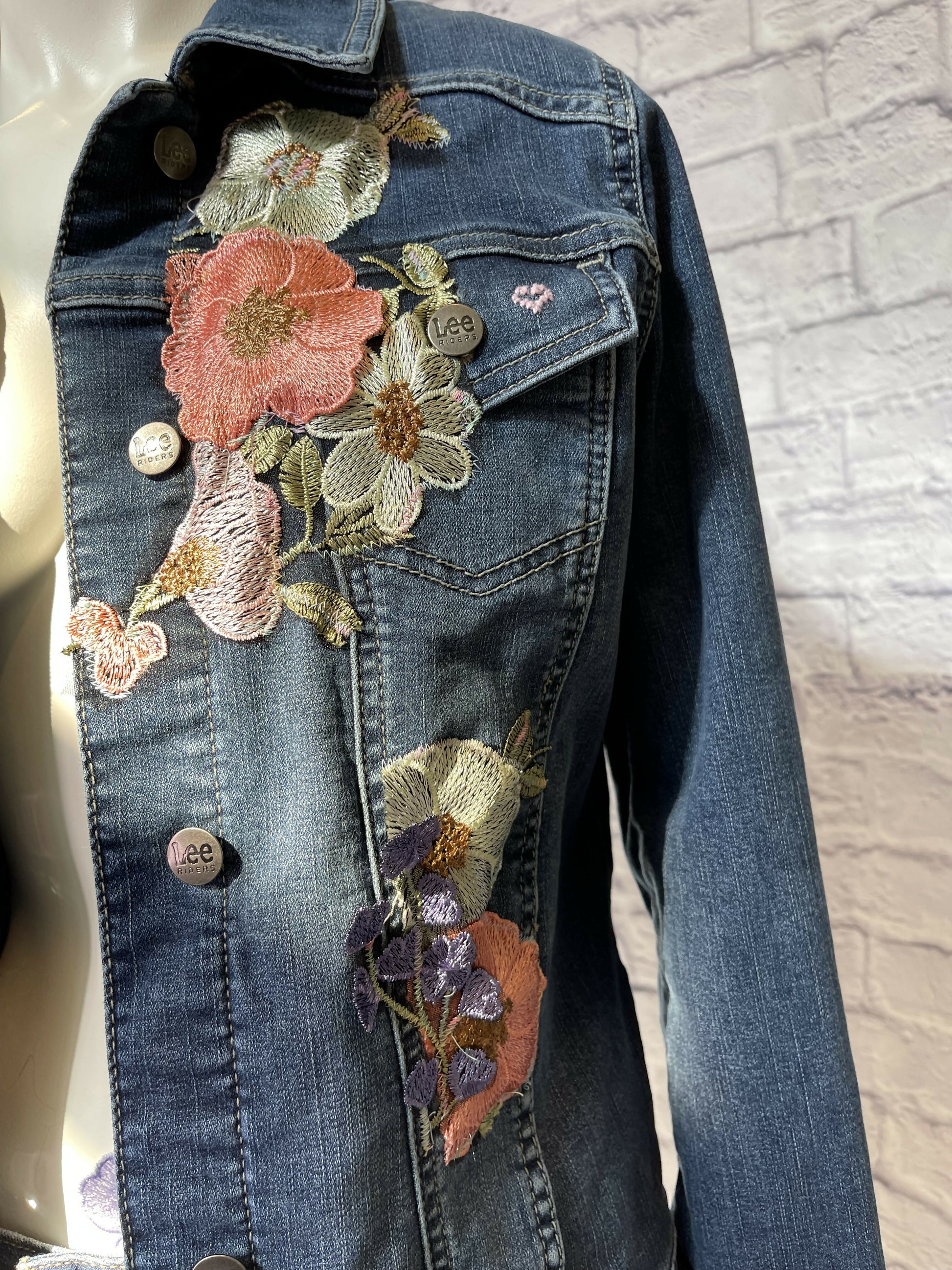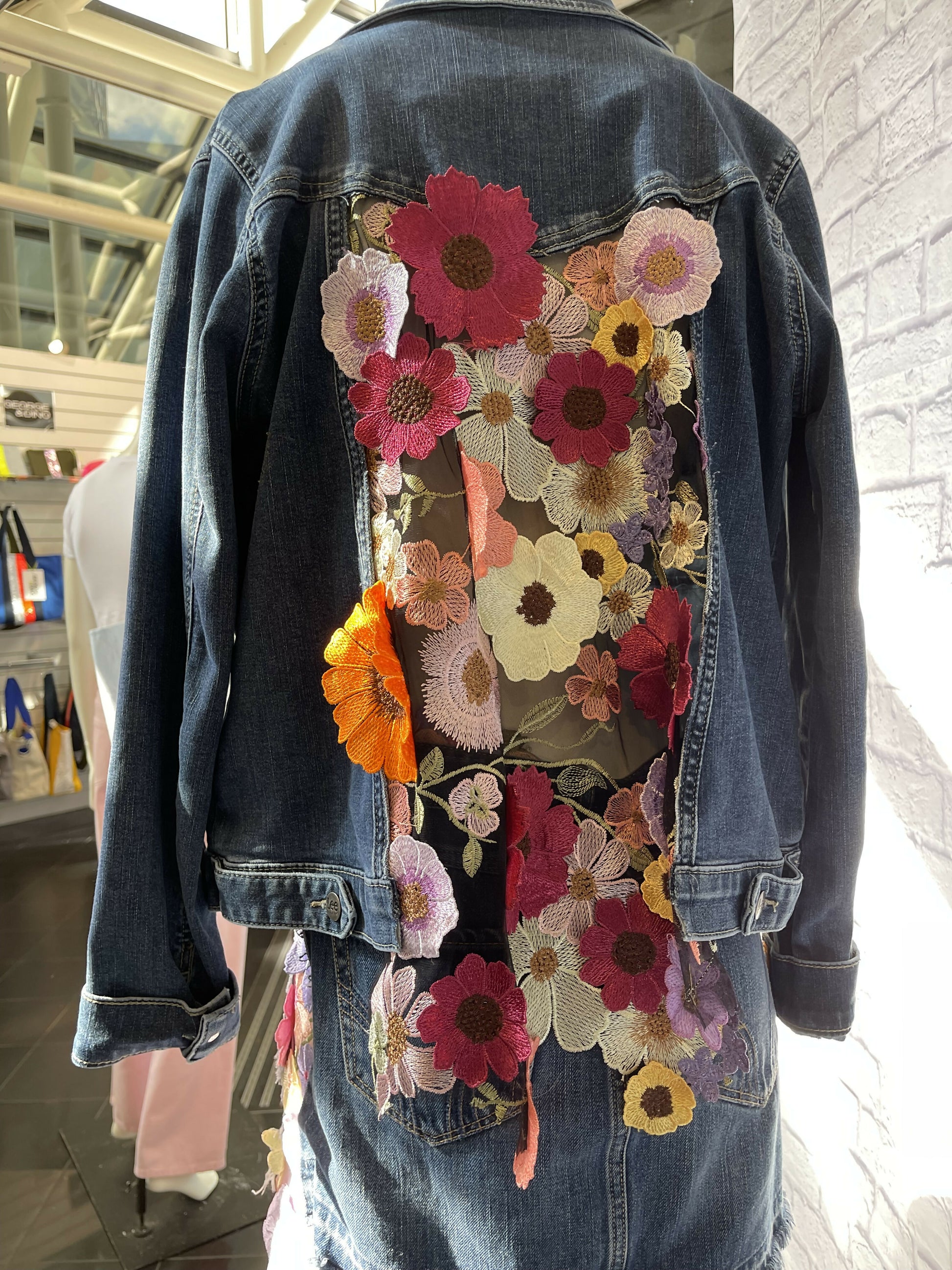 M/l denim jacket cut out back with 3d applique treatment . Floral application on front to partner to back.