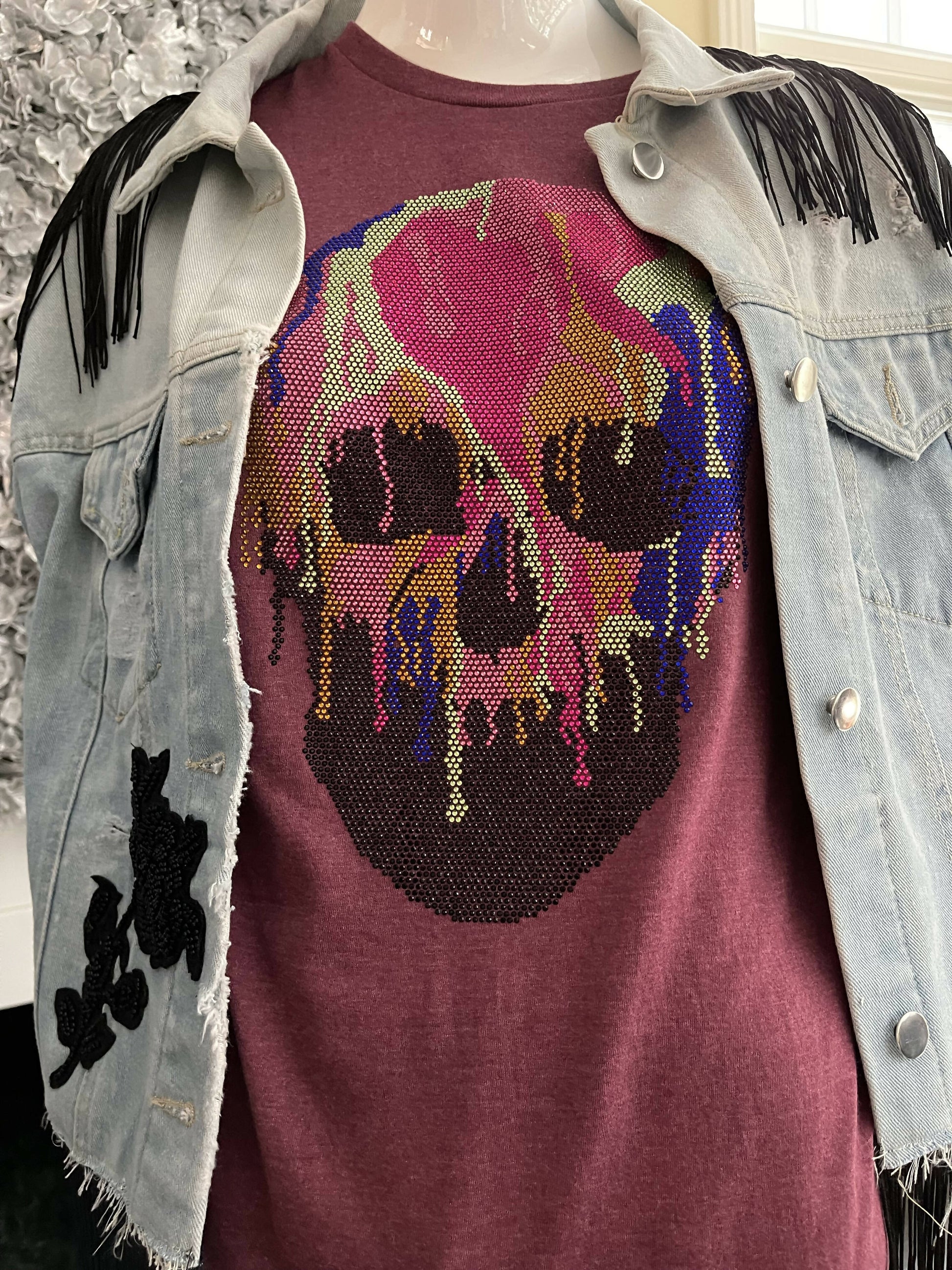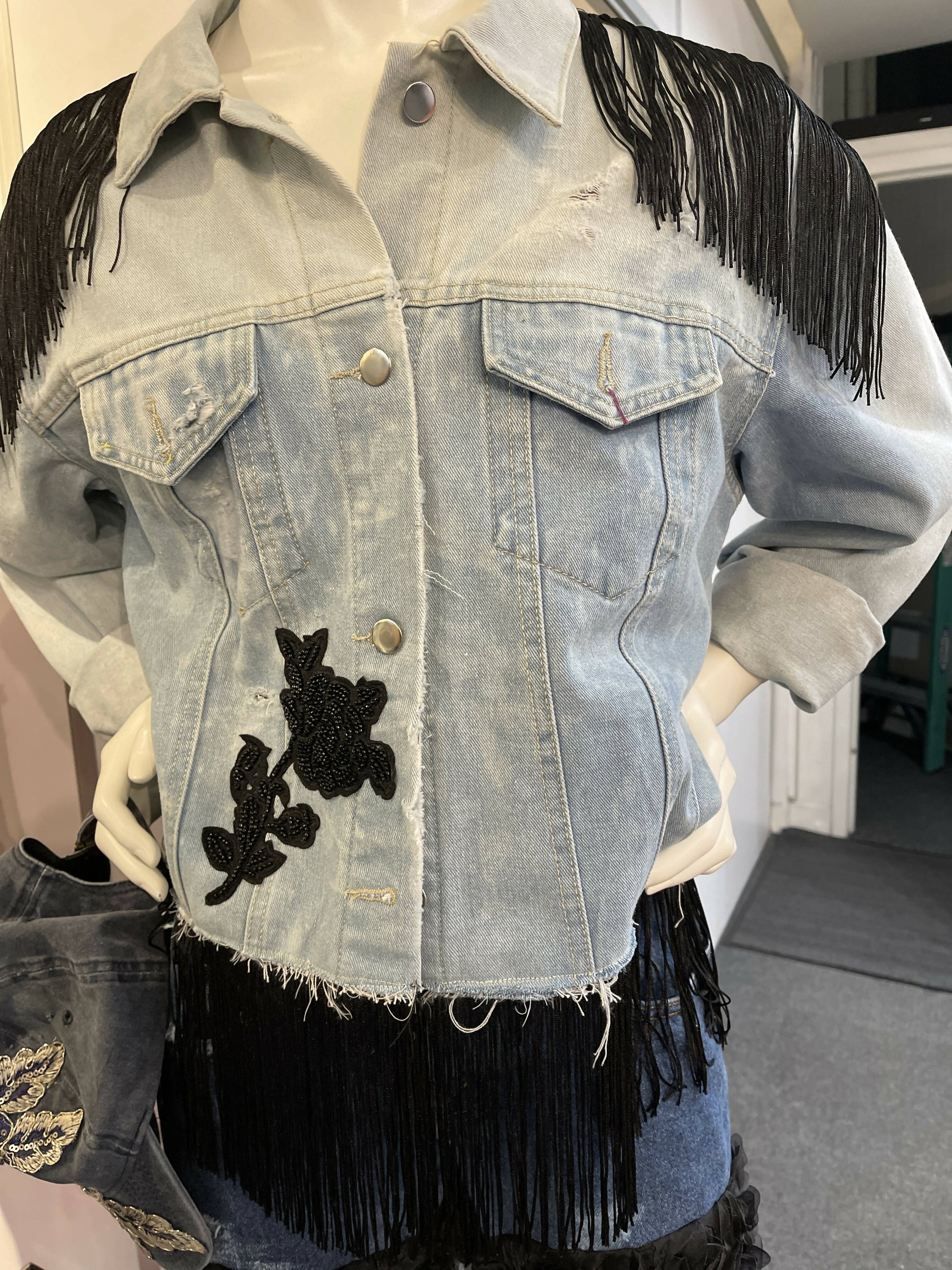 Large denim jacket with fringe sequin flower applique.