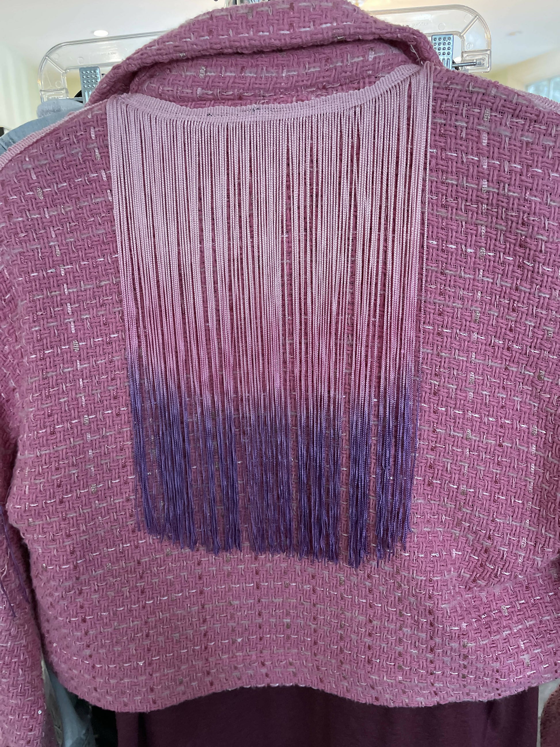 Pink tweed blazer with ombré pin 12in fringe on front and back size med.