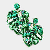 Green Stone Embellished Seed Beaded Tropical Leaf Dangle Earrings