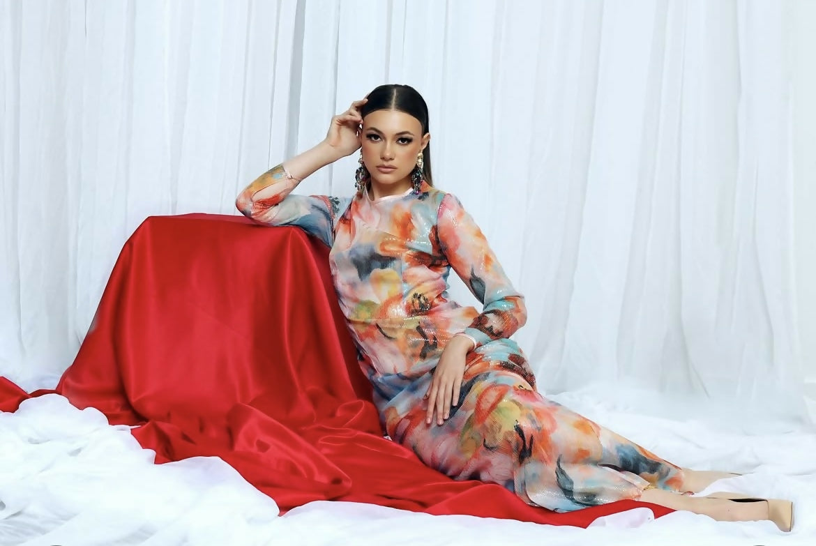 Turn heads from beachside strolls to cocktail soirées in our Bold Floral Sequin Bodycon Dress. Crafted from luxurious Italian-imported sequin fabric, this dress dazzles with vibrant floral prints that radiate confidence and glamour. The sleek bodycon silhouette hugs your curves in all the right places, while structured Mikado detailing at the neckline and cuffs adds a sophisticated touch. Whether you're stepping into the sun or under the stars, this standout piece is your go-to for making an unforgettable entrance.
