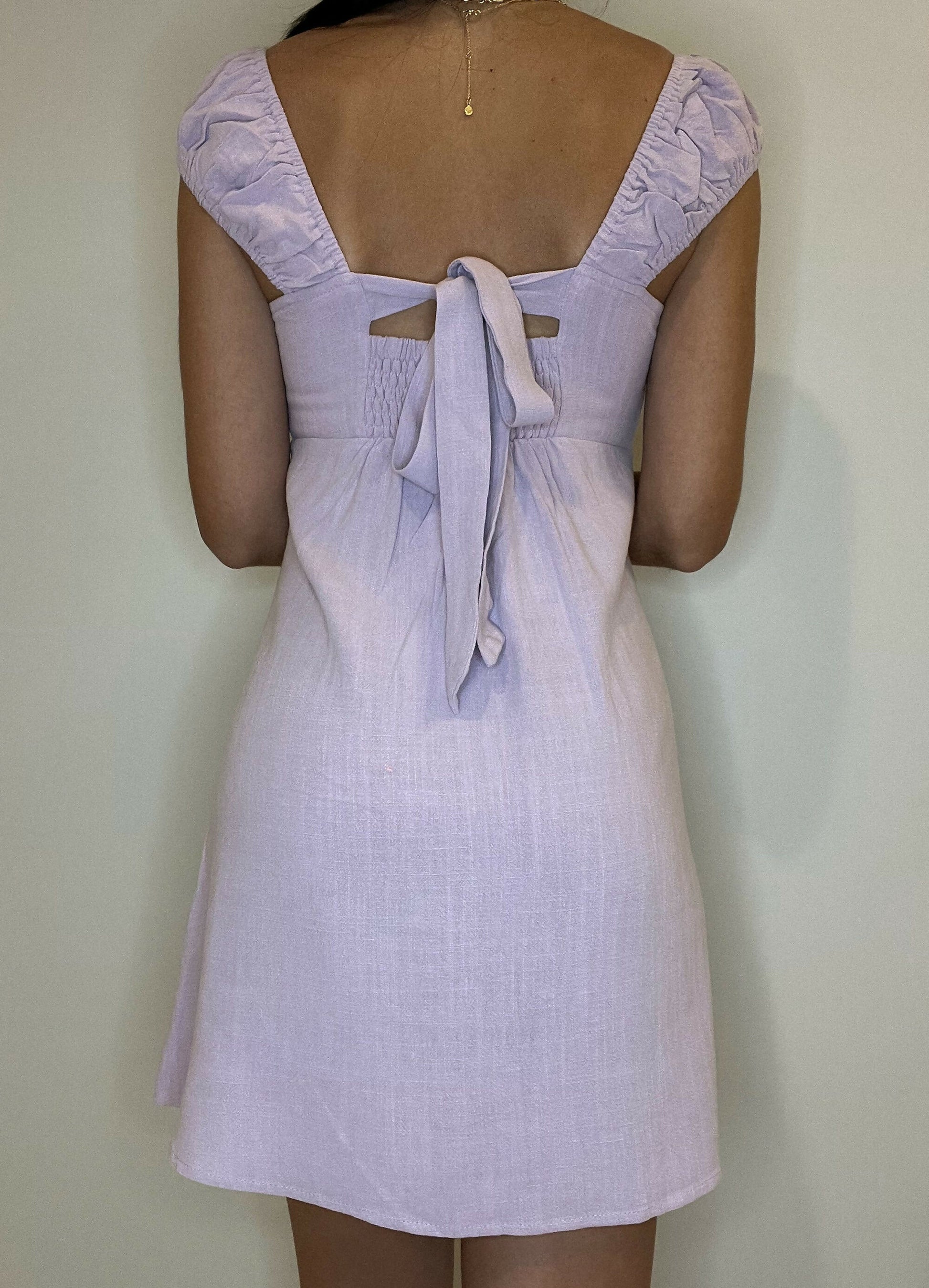 This adorable mini a-line dress features cute cap sleeves, a ruched bust and smocked, tie back details for a flattering fit. This dress is perfect for a bridal shower, bachelorette party or a fun date night.
