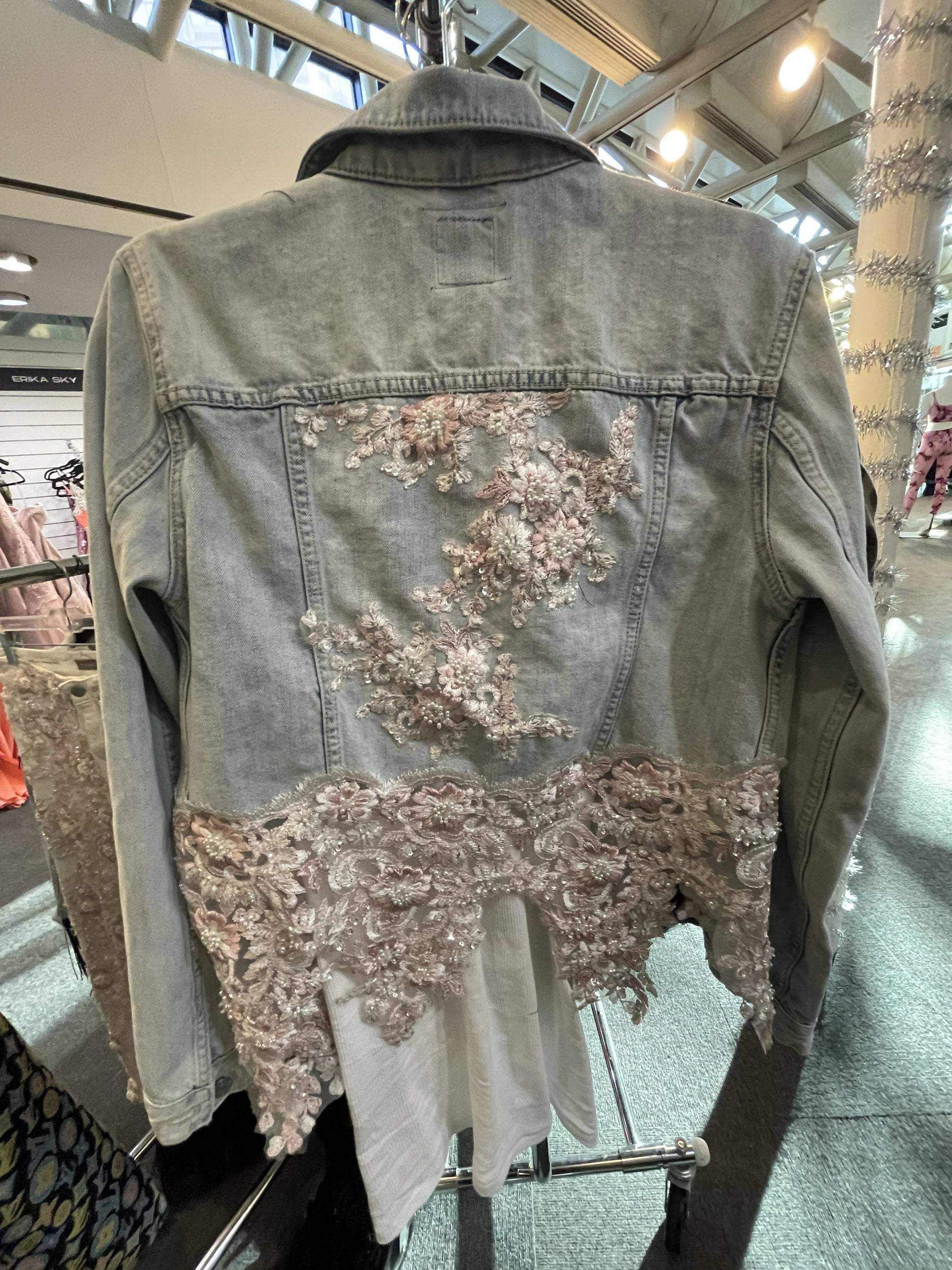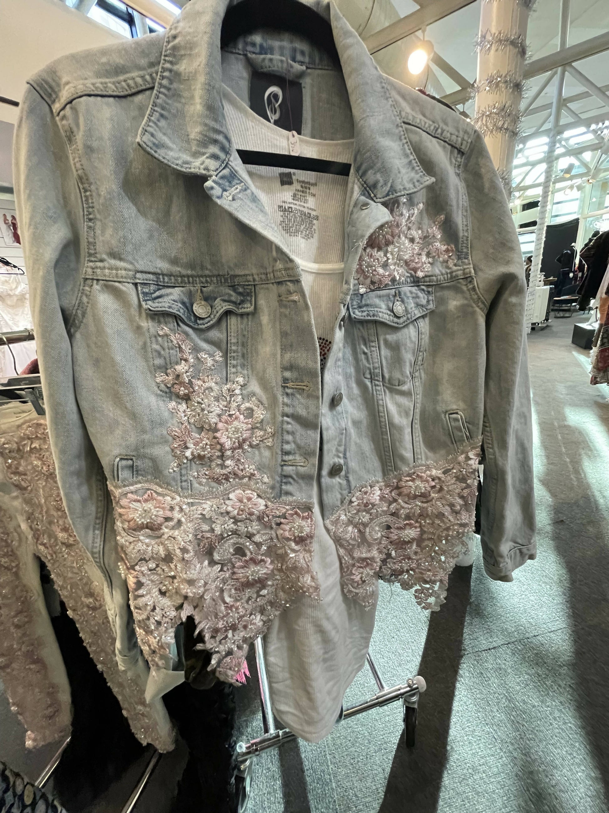 Lg blue denim jacket (med) with 3d sequin floral applique on front and back