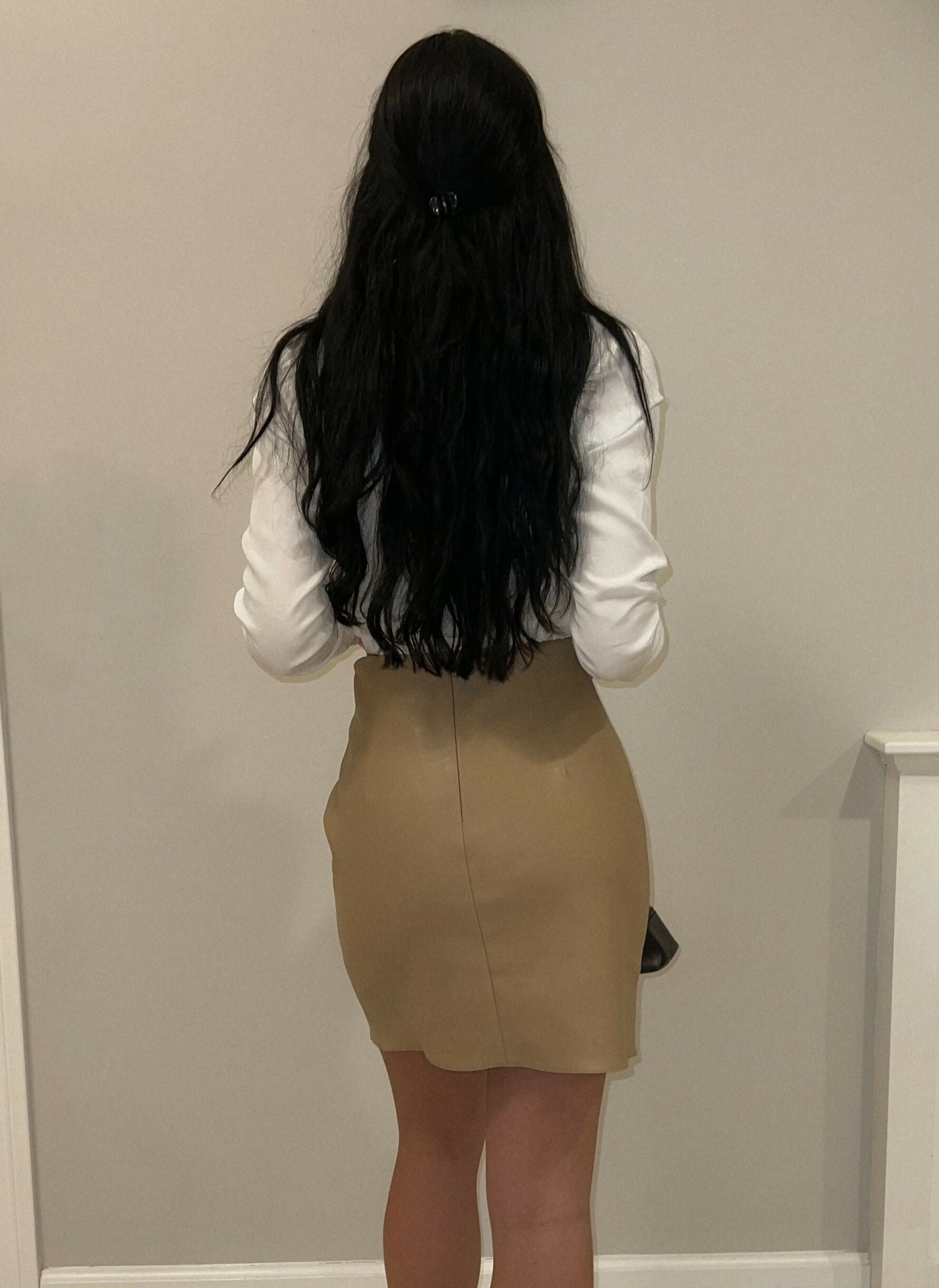 Dress to impress with this high-waisted pencil skirt. Perfect for any occasion, this buttery soft, faux leather style features a front tie and slit, back zipper and suede material inside.