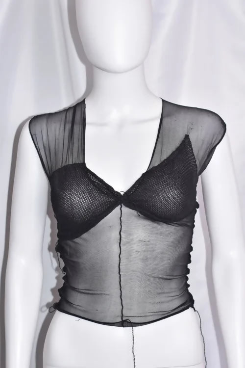 Hand sewn 20 denier nylon with whip stitch over with machine knit lyocell bralette with deconstructed seams with crotchet fringe: Customizable and made to order.